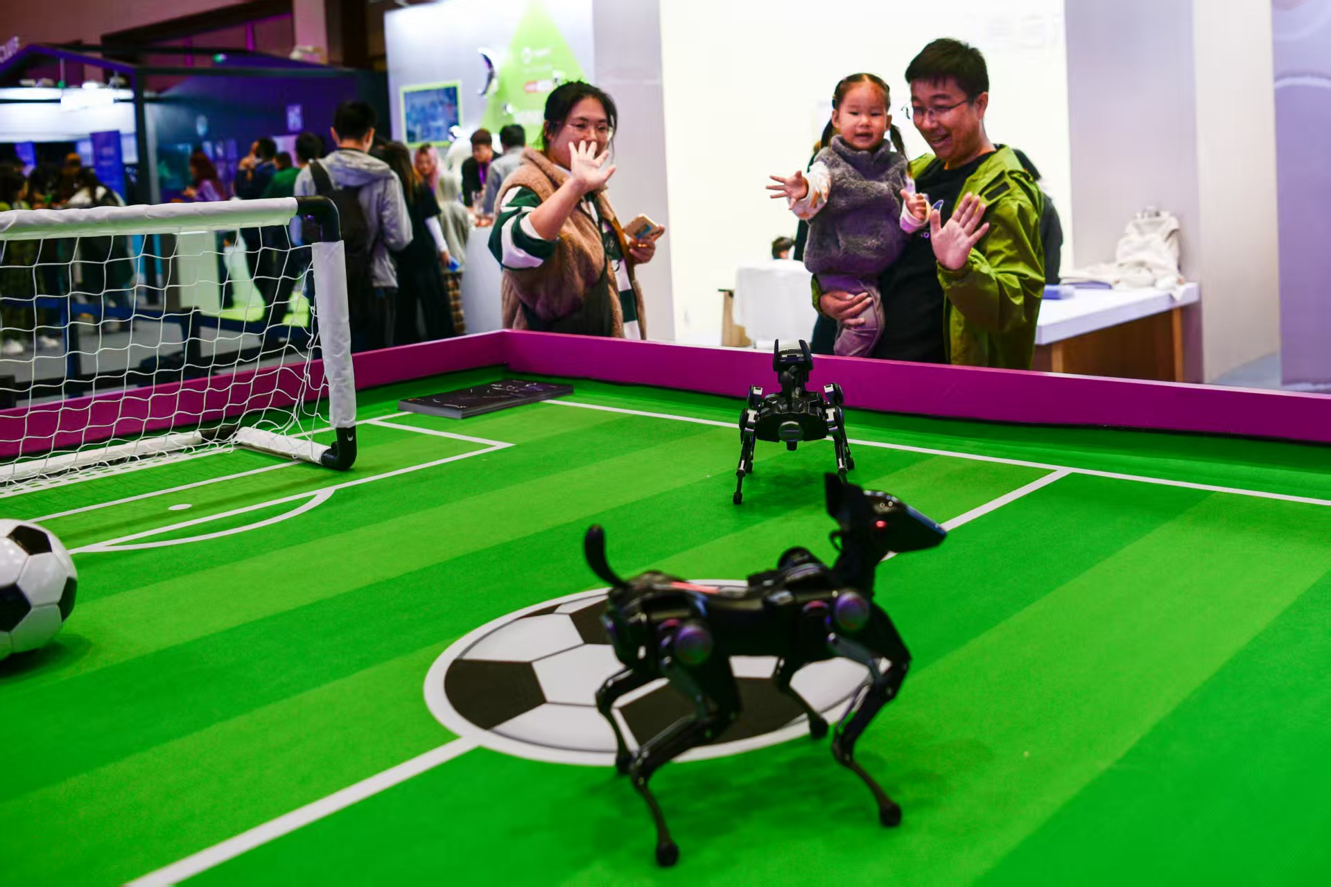 在机器人乐园展区,两只哮天Sirius机器狗在足球场上你来我往。恒之未来(重庆)创新科技有限公司首席市场官康啸虎介绍,“哮天”是企业研发的首款小型四足机器人,也是目前一公斤级以下最灵活的机器人,目前主要被用作二次开发平台以及情感陪伴玩具,在海外众筹平台已卖出约千台,预计将在年底量产交付。