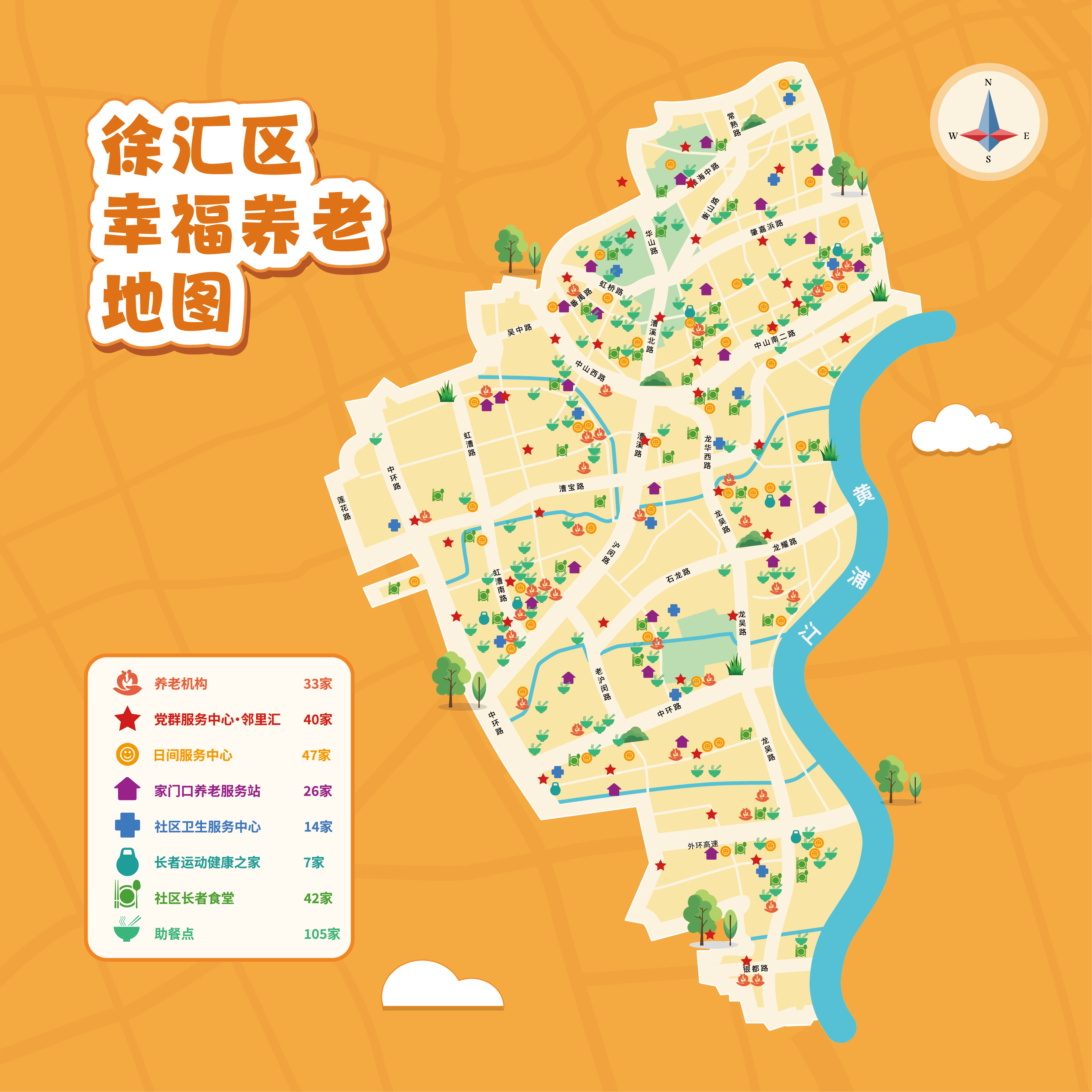 重阳节将至,徐汇区的老年人们收到了一份特殊的“礼物”——徐汇区幸福养老地图。这份地图标出了徐汇33家养老机构、26个家门口养老服务站、42家长者食堂、105个助餐点等300余个养老服务场所,让银发族能更方便地找到身边的养老资源。