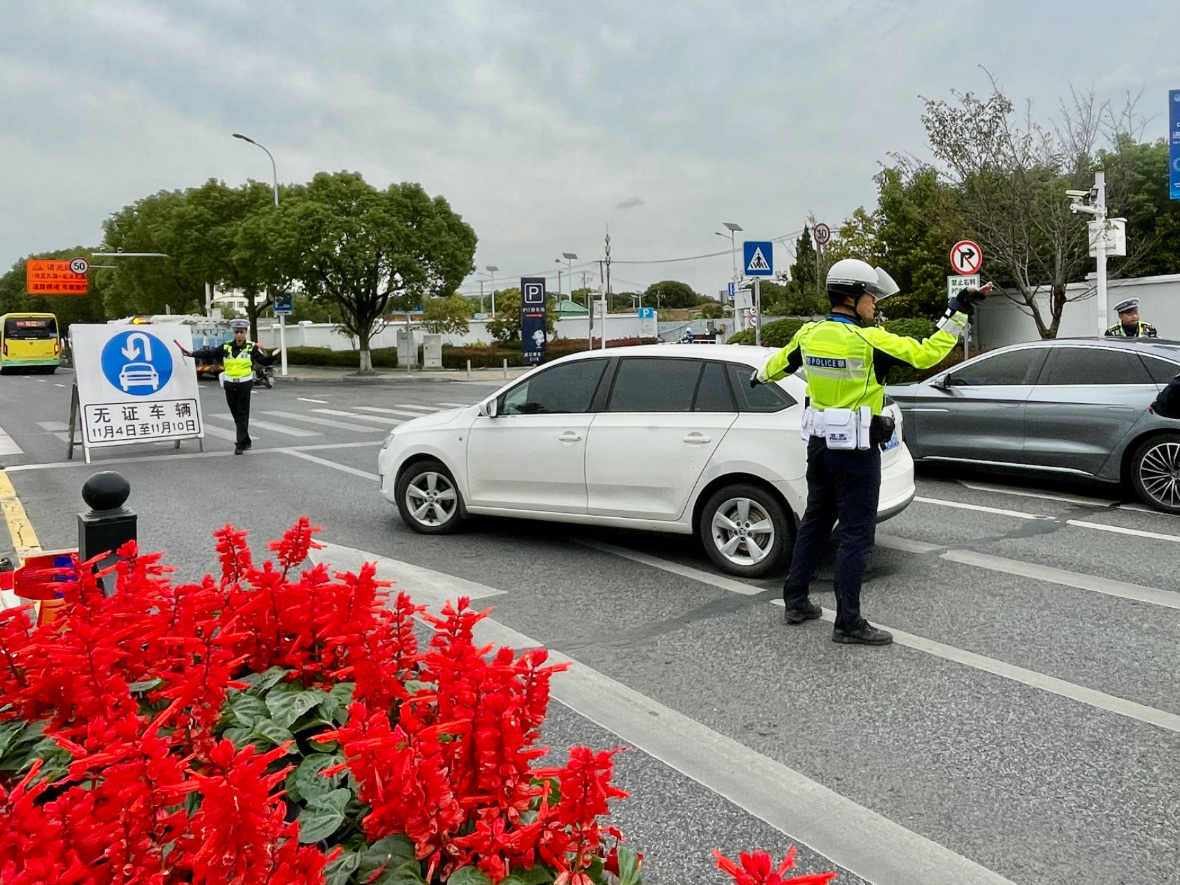 头图为管控举措实施首日,民警正在对无证车辆进行绕行指引。劳动报记者 包璐影 摄影