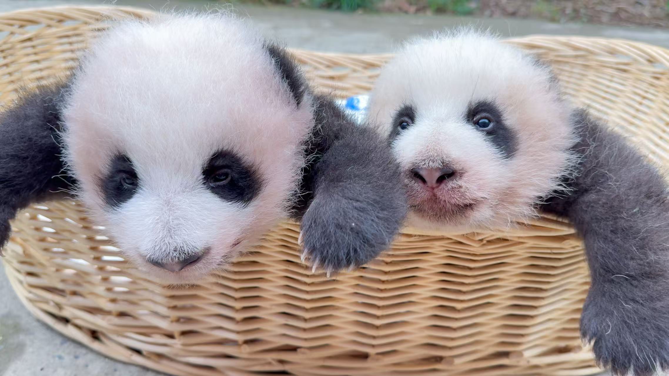头图为憨态十足的大熊猫龙凤胎。野生动物园供图