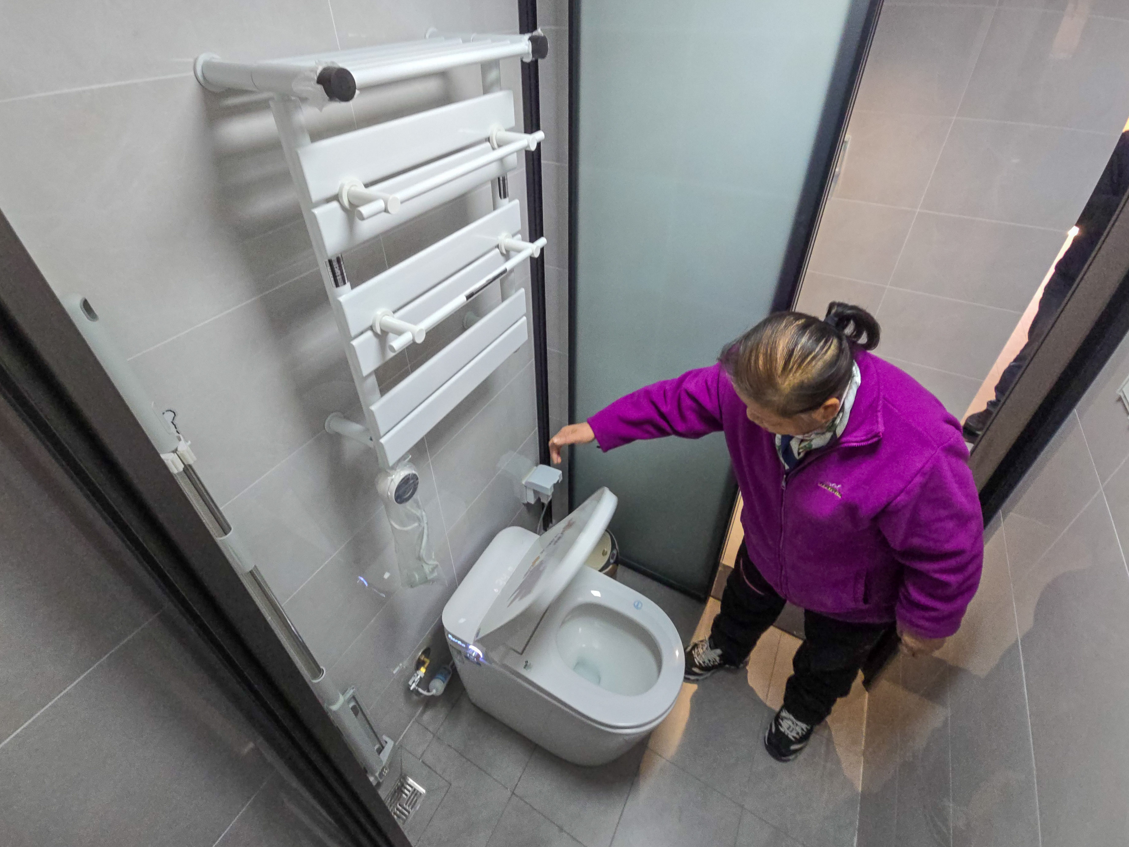 顾兰妹在卫生间内安装了智能马桶和毛巾架。劳动报记者颜筱依 摄影
