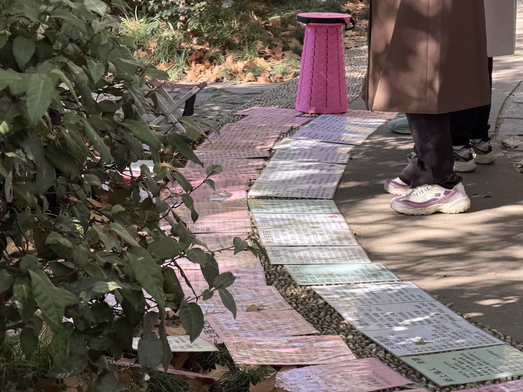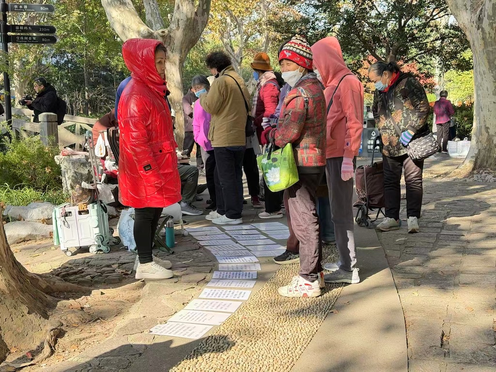 刚走进鲁迅公园,顺着人流往深处走,寒风中隐约传来此起彼伏的交谈声,裹着厚外套、围着围巾的人们脚步匆匆,却都朝着同一个方向聚集。转过一个拐角,眼前的景象瞬间将人拉入一场特殊的“招聘会”——地上、长椅上、树干旁,数百张A4纸整齐排列,有的被透明塑料袋裹着防风吹散,有的被石头压着固定位置,一张张征婚启事上,年龄、学历、身高、房产、收入等信息密密麻麻,堪称中国式婚恋最赤裸的“价码表”。