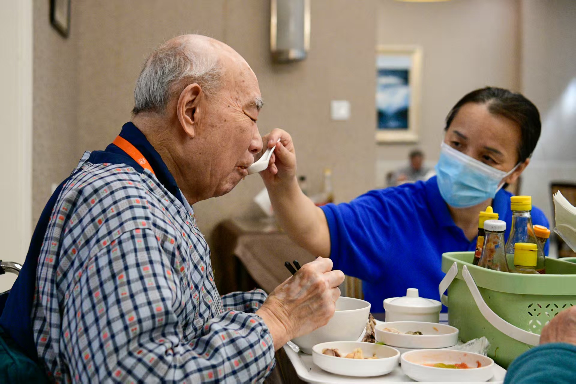 头图为护理员在给老人喂饭。劳动报记者颜筱依 摄影