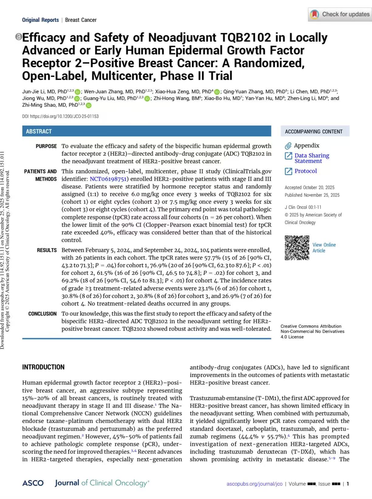临床试验结果显示,患者总病理学完全缓解率最高达到76.9%,且兼具良好安全性,提示新型HER2双表位ADC药物未来或将成为HER2阳性乳腺癌新辅助治疗的“新星”。此项重磅研究成果日前已在国际肿瘤学顶级期刊《临床肿瘤学杂志》(JCO)发表。邵志敏教授为该研究通讯作者,李俊杰医生为第一作者,该文章影响因子为43.4分。
