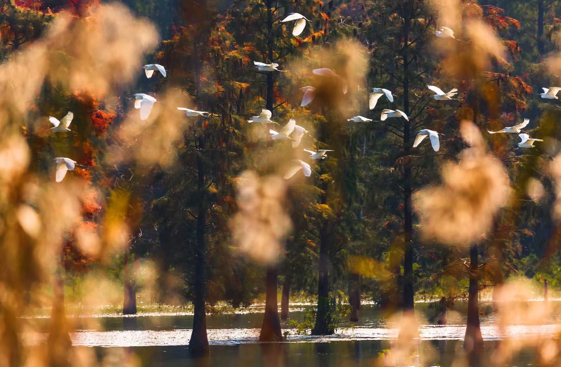 水上森林区域,杉树林立、鹭鸟翩跹(资料图)。上海青西郊野公园供图