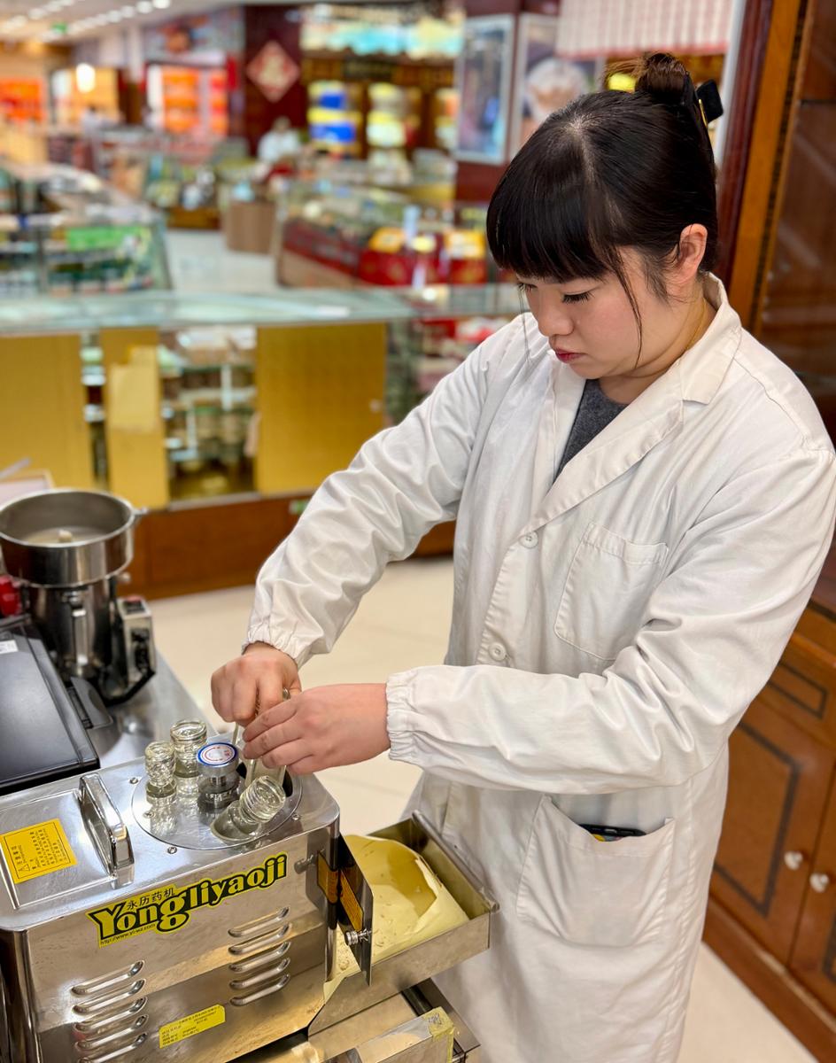 “这份功效背后,是非遗技艺的坚守:道地药材经12小时浸渍、3道提取、4次浓缩,再以‘武火煮沸、文火收汁’熬至‘滴药成珠、膏滋挂旗’。”童涵春堂相关负责人介绍,即便机械化普及,童涵春堂仍坚持“一人一方一铜锅”手工操作,让每一勺膏方都承载百年匠心。