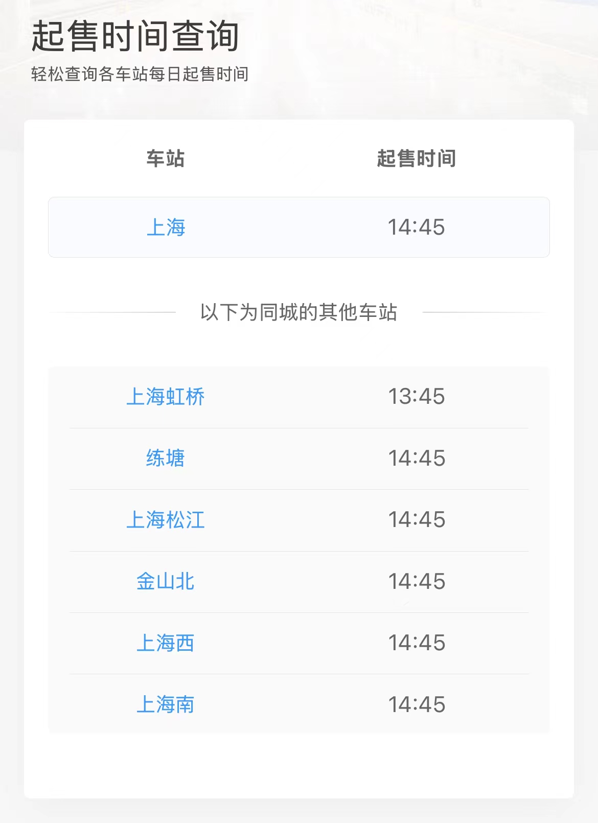 以上海几大火车站为例:上海站14:45、上海虹桥13:45、上海南站14:45、上海松江:14:45,当然,旅客也可以打开12306官网,点击“信息查询”栏目下的“起售时间”,再选择起售日期和起售车站进行查询。