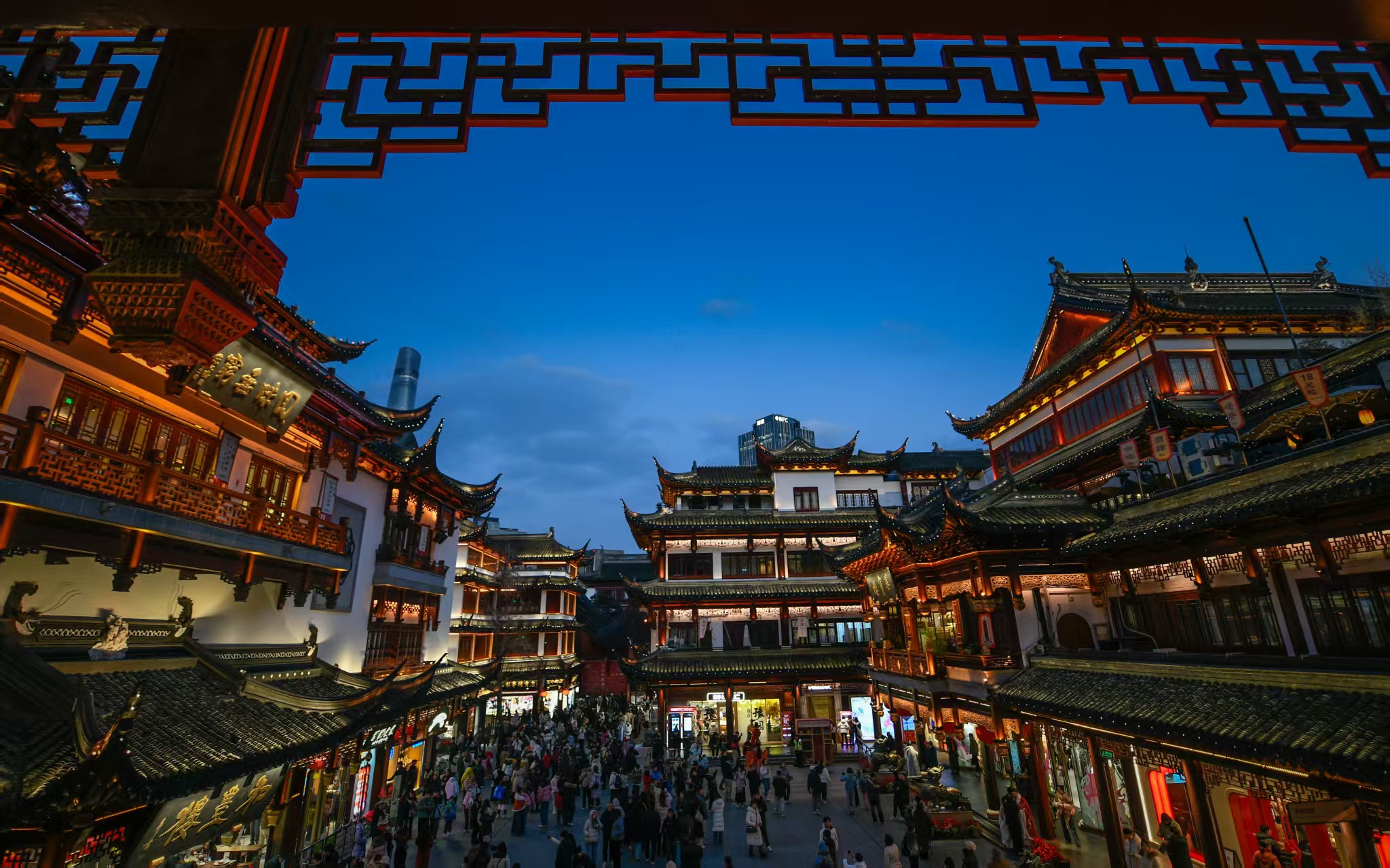 夜幕蓝调下的豫园别有一番风韵。劳动报记者 颜筱依 摄影