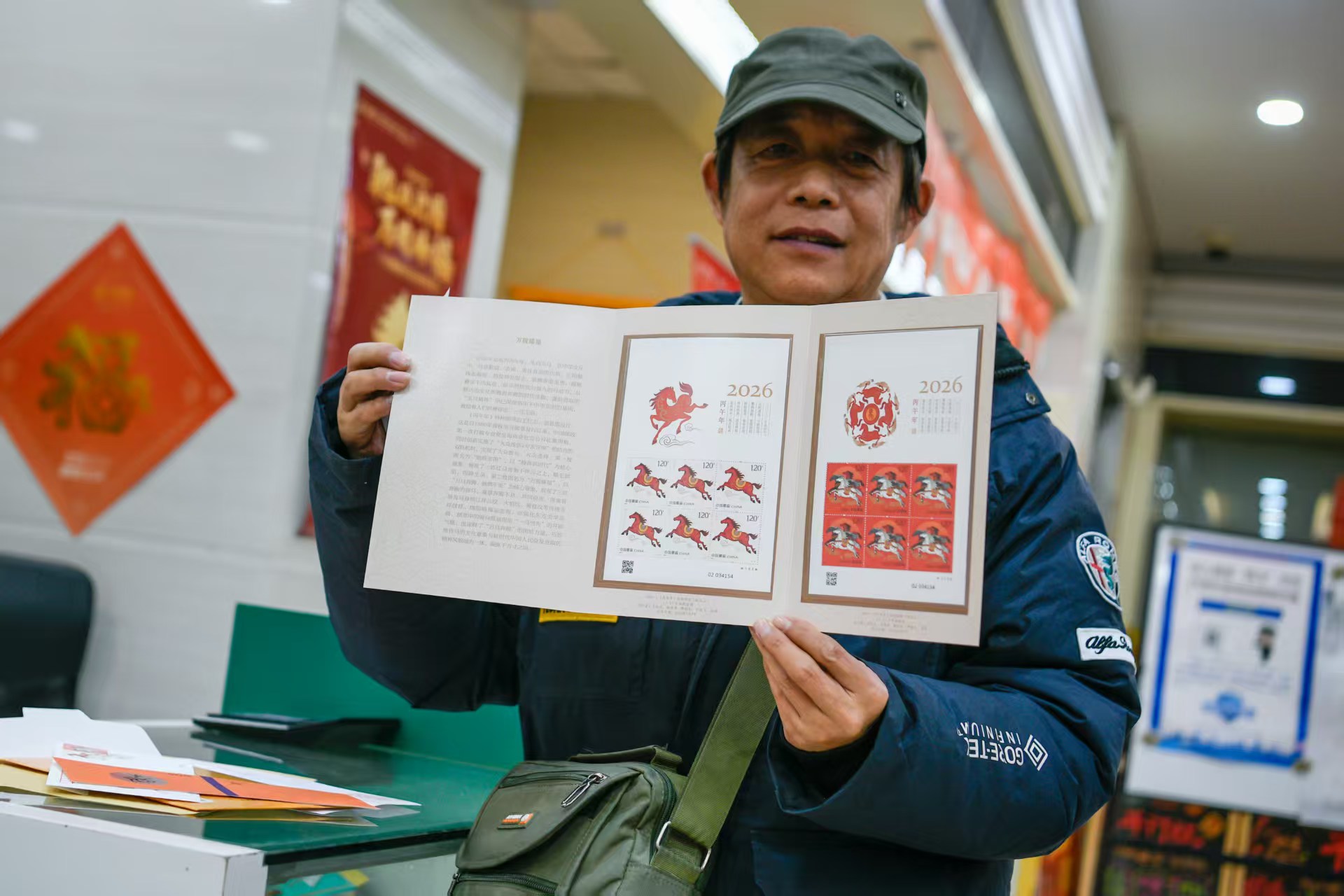 头图为爷叔展示买到的马年生肖邮票。劳动报记者颜筱依摄影