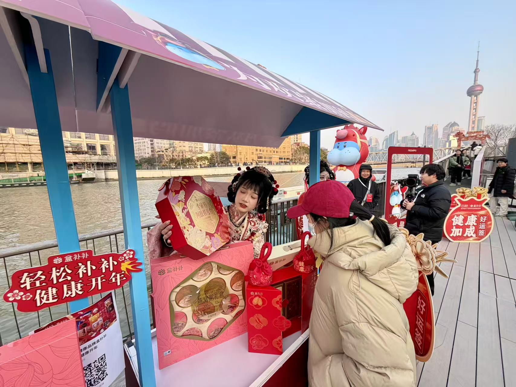 本次快闪活动以“马年迎福、为新年加码”为核心,现场设置多重互动体验。游客不仅能打卡游船与苏州河交融的绝美机位,还可与盒马旗下“盒补补”品牌的新春小福娃、国风健康官亲密互动。参与绕口令挑战可领取健康小福袋”,身着汉服或完成指定打卡发布,还能参与好运抽签,有机会赢取武夷岩茶、西洋参红参、东阿阿胶糕等滋补好物。线上端,游客在小红书发布与超大盒马公仔的合影,带话题并艾特指定账号,点赞前10名可获得“清空盒马百元购物车”资格,线上线下联动让福利与年味双重升级。