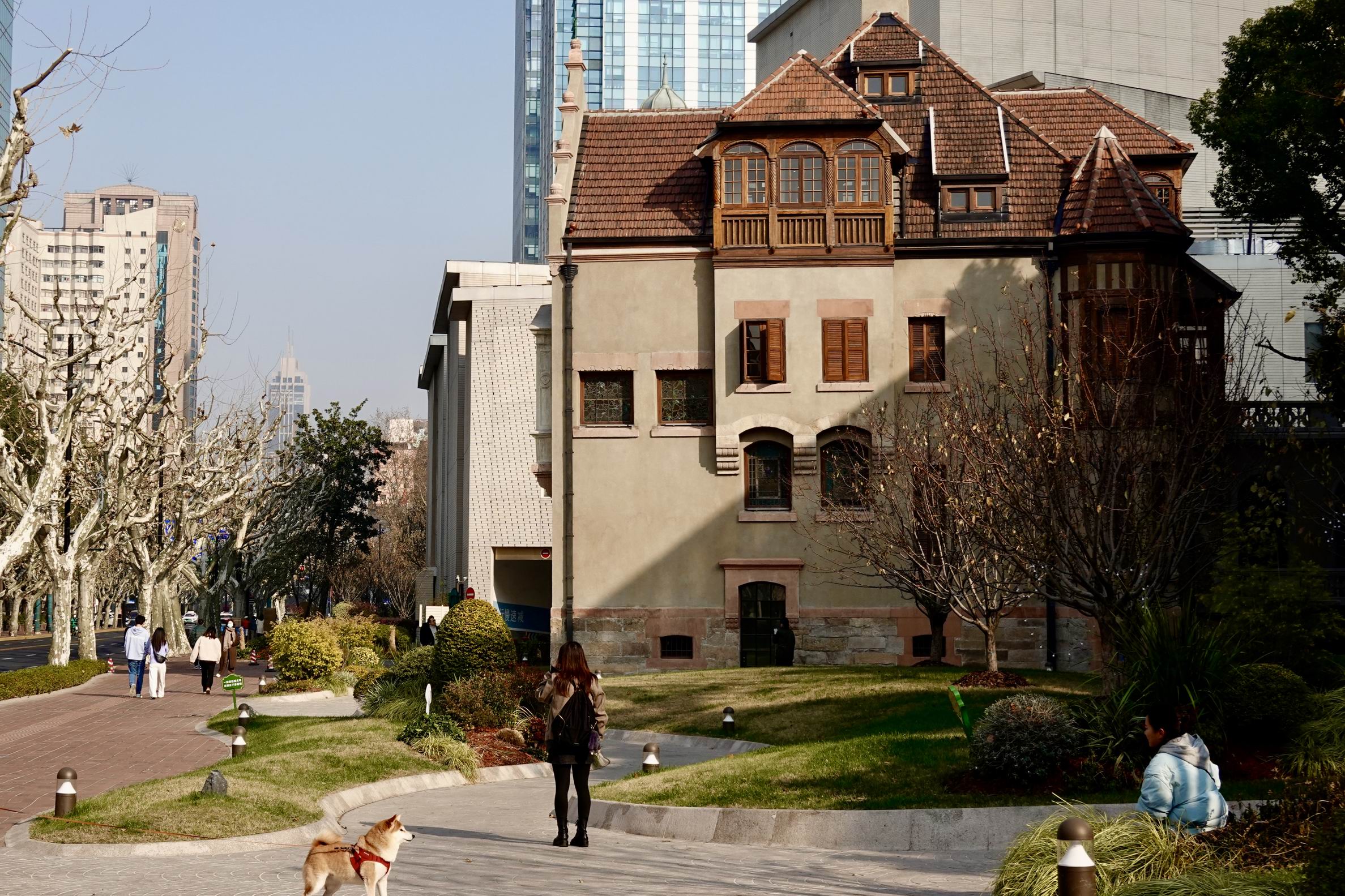 华政滨河步道的独特之处,在于与百年校园的无缝相融。这里是圣约翰大学旧址,27栋百年建筑被列为全国重点文物,冬日里更显沉静厚重。红墙绿瓦的韬奋楼、思孟堂外墙上“学而不思则罔”的石碑、有着“华政小故宫”之称的交谊楼,都在寂静中诉说着往昔故事。
