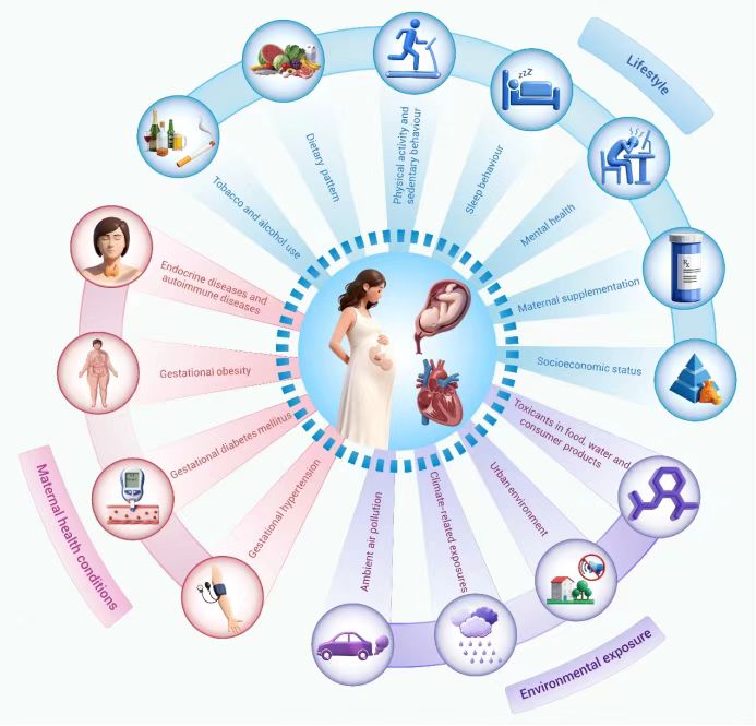 在影响胎儿心血管发育的众多因素中,母体健康状况是最早被关注、证据也最为充分的一项。妊娠期高血压、高血糖症、肥胖及代谢异常等问题,不仅会增加不良围产期结局的风险,更被多项研究证实,与子代在儿童期、青少年期出现血压升高、心室结构改变、血管顺应性下降等情况密切相关。