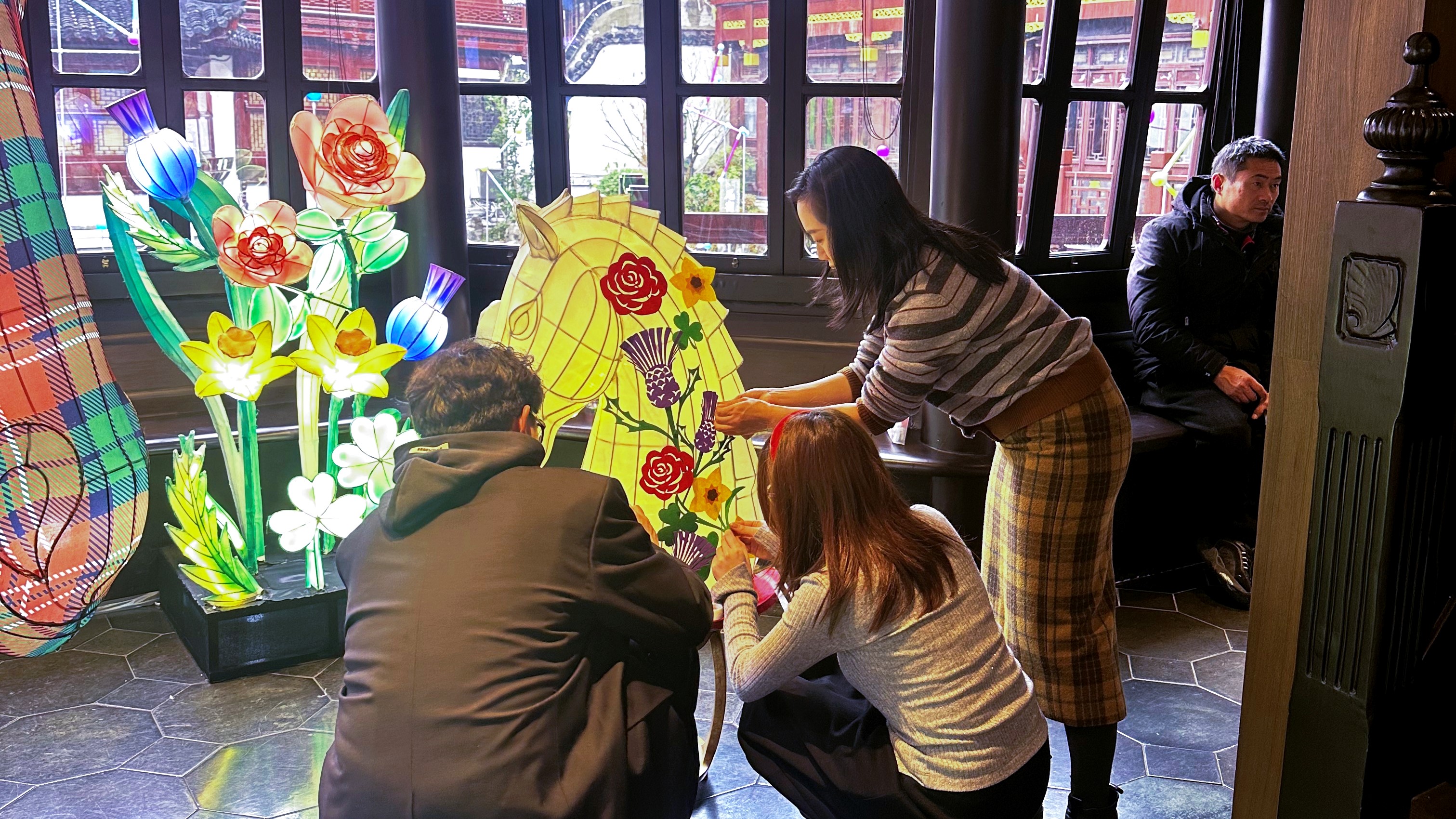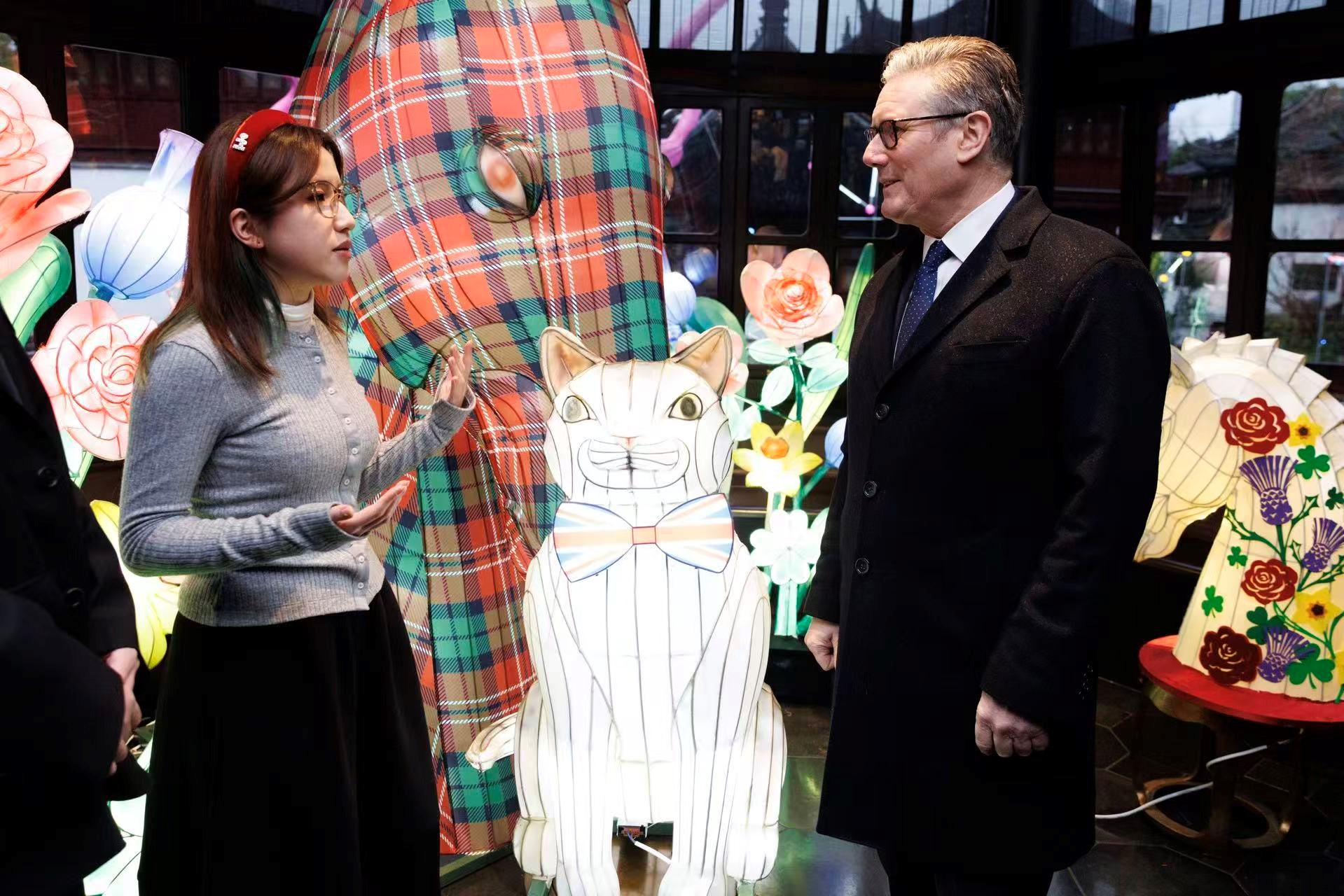1月30日,英国首相斯塔默刚落地上海,就直奔豫园。买一份香酥的蝴蝶酥,走一走九曲回廊,行至湖心亭时,他登上“海上第一茶楼”,在这里收获了一份特别的惊喜——来自东华大学学生设计制作的中英元素花灯艺术装置。