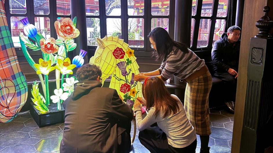 这组花灯藏满跨洋巧思,一侧错落排布着红色双层巴士、巴特斯发电站、格伦芬南高架桥、巨石阵等英国地标,一条象征黄浦江与泰晤士河的流水纹样将这些元素串联,仿佛让两条河流跨越山海交汇。另一侧,以唐宁街“首席捕鼠官”拉里猫为原型的花灯憨态可掬,一下吸引了斯塔默的目光。“首相特别喜欢这只猫灯,还笑着说想把它带回英国呢。”东华大学学生李昕蔚笑着透露。而值得一提的是那盏饰有典型苏格兰格纹的马头灯饰,“今年是马年,我们特意设计了这款马头,还融入了代表英国元素,让祝福更有心意。”