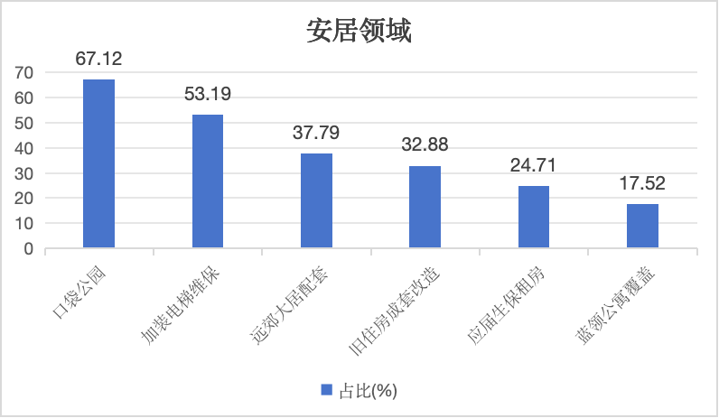 在安居领域,“增加家门口的‘口袋公园’和社区步道、健身设施”以5275票(占比67.12%)居首,超六成七受访者关注;“解决老旧小区加装电梯后的维保和管理问题”获4180票(占比53.19%)。