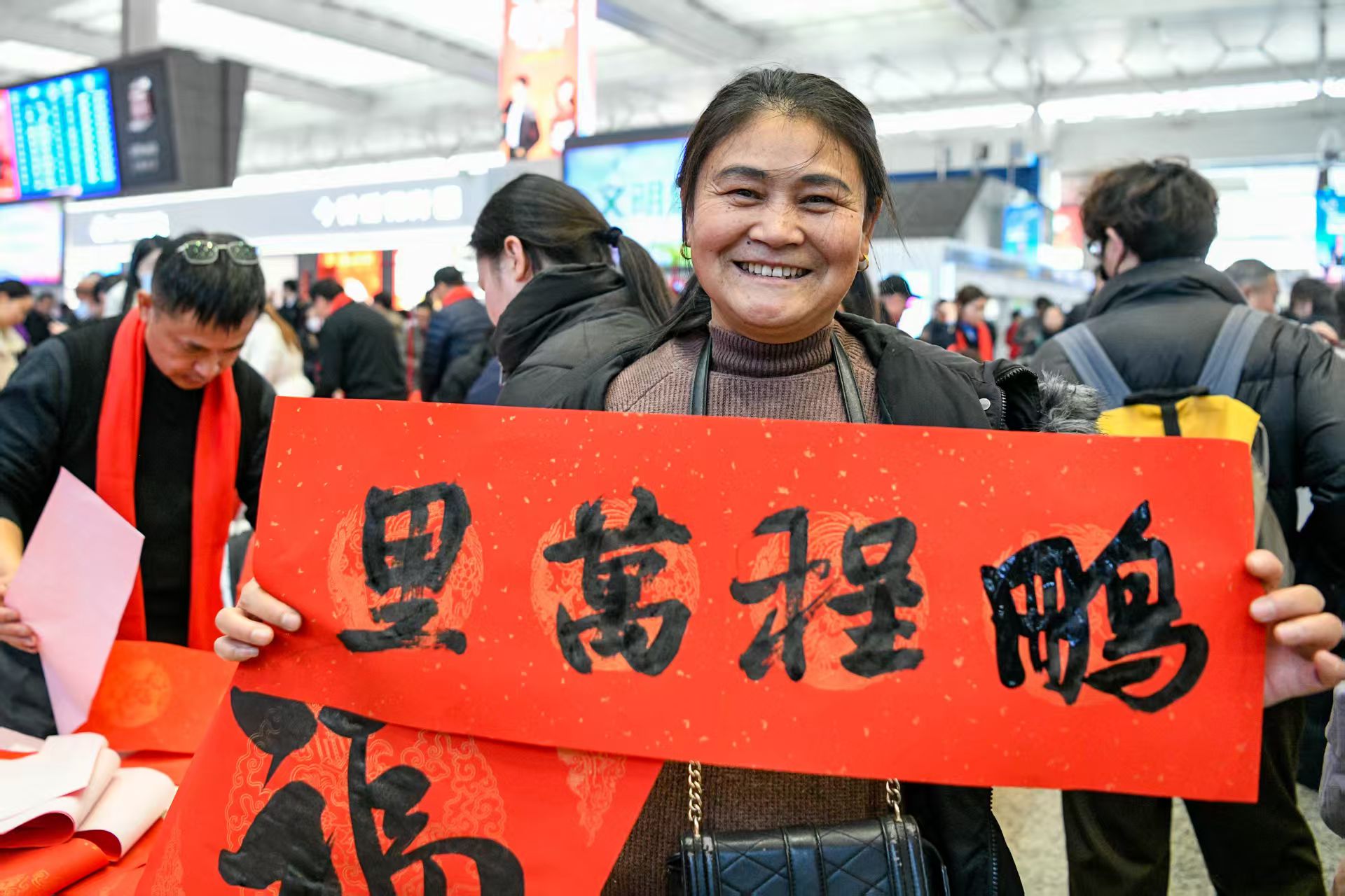 车站内送春联、写福字活动缤纷、热闹非凡。劳动报记者 颜筱依 摄影