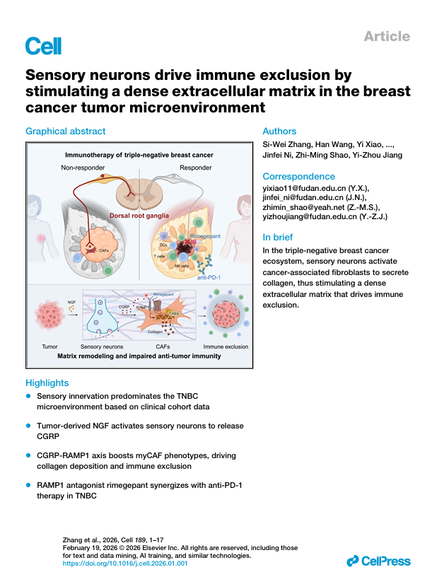 北京时间2026年2月6日凌晨,复旦大学附属肿瘤医院乳腺肿瘤中心主任邵志敏教授、复旦大学附属肿瘤医院副院长江一舟教授领衔团队,联合复旦大学脑科学转化研究院倪金飞教授团队,在国际顶刊《细胞》(Cell)在线发表研究论文,从最新癌症神经科学研究视角出发,首次揭示肿瘤中的感觉神经是导致部分三阴性乳腺癌患者免疫治疗在短期内耐药的“元凶”,并基于动物模型实验,发现了一种用于治疗偏头痛的药物可用于增敏免疫治疗,为破解三阴性乳腺癌患者免疫治疗耐药提供了“中国方案”。