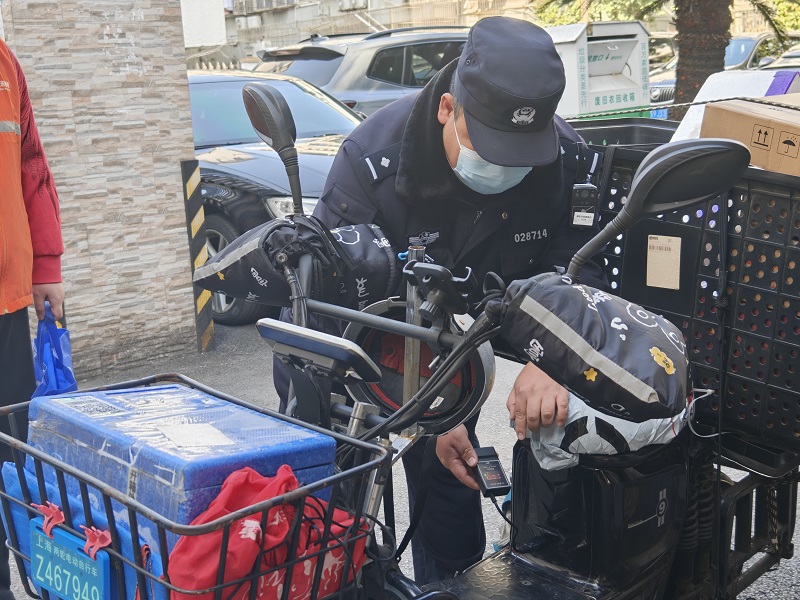 头图为民警正在使用电流检测设备核查电动自行车电流状态是否异常。静安警方供图