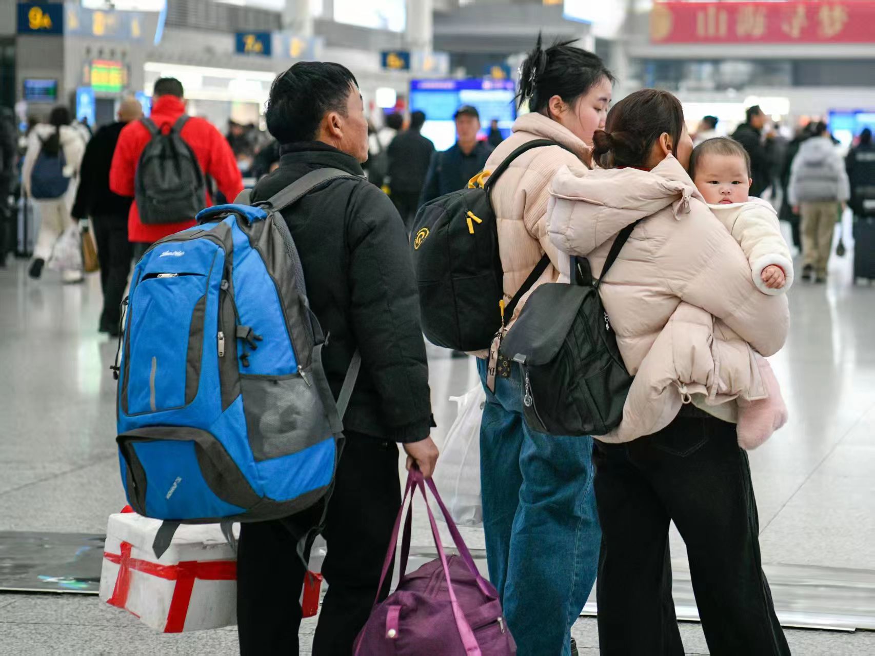 铁路候车大厅内,举家返乡的身影随处可见。摄影 颜筱依