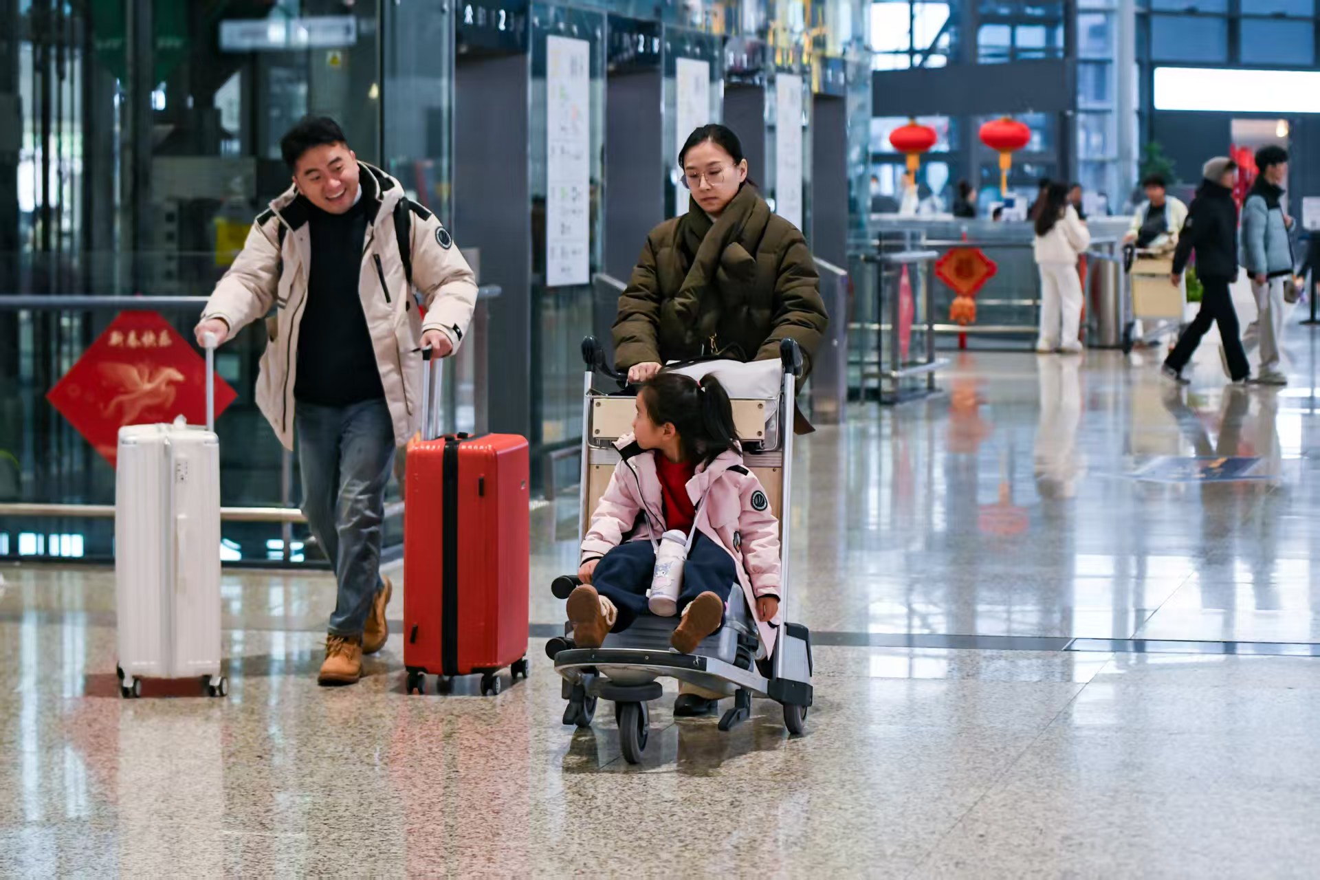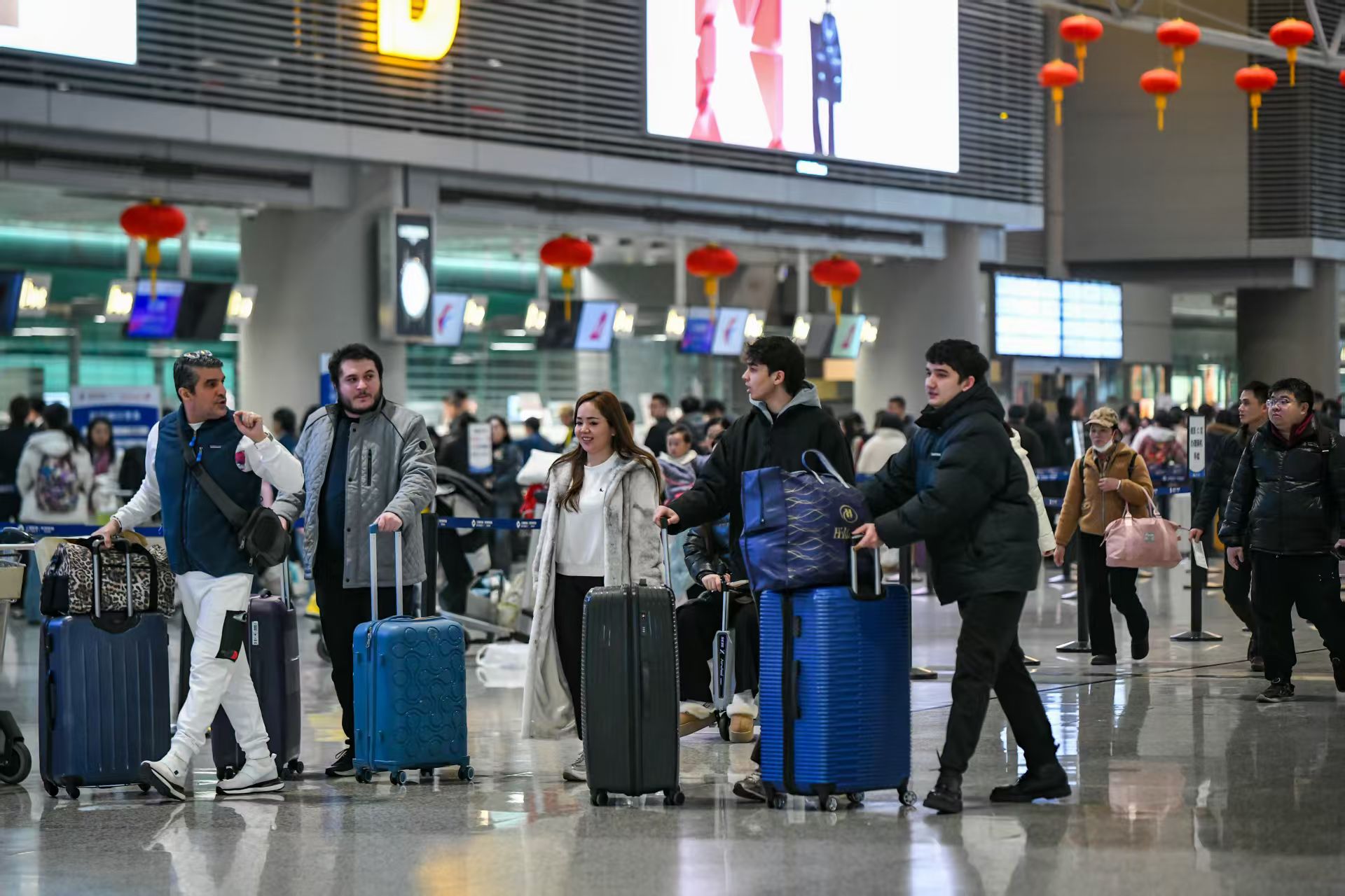 虹桥机场候机楼内,外国友人也“组团”出行,成为春运旅客中的一员。摄影 颜筱依