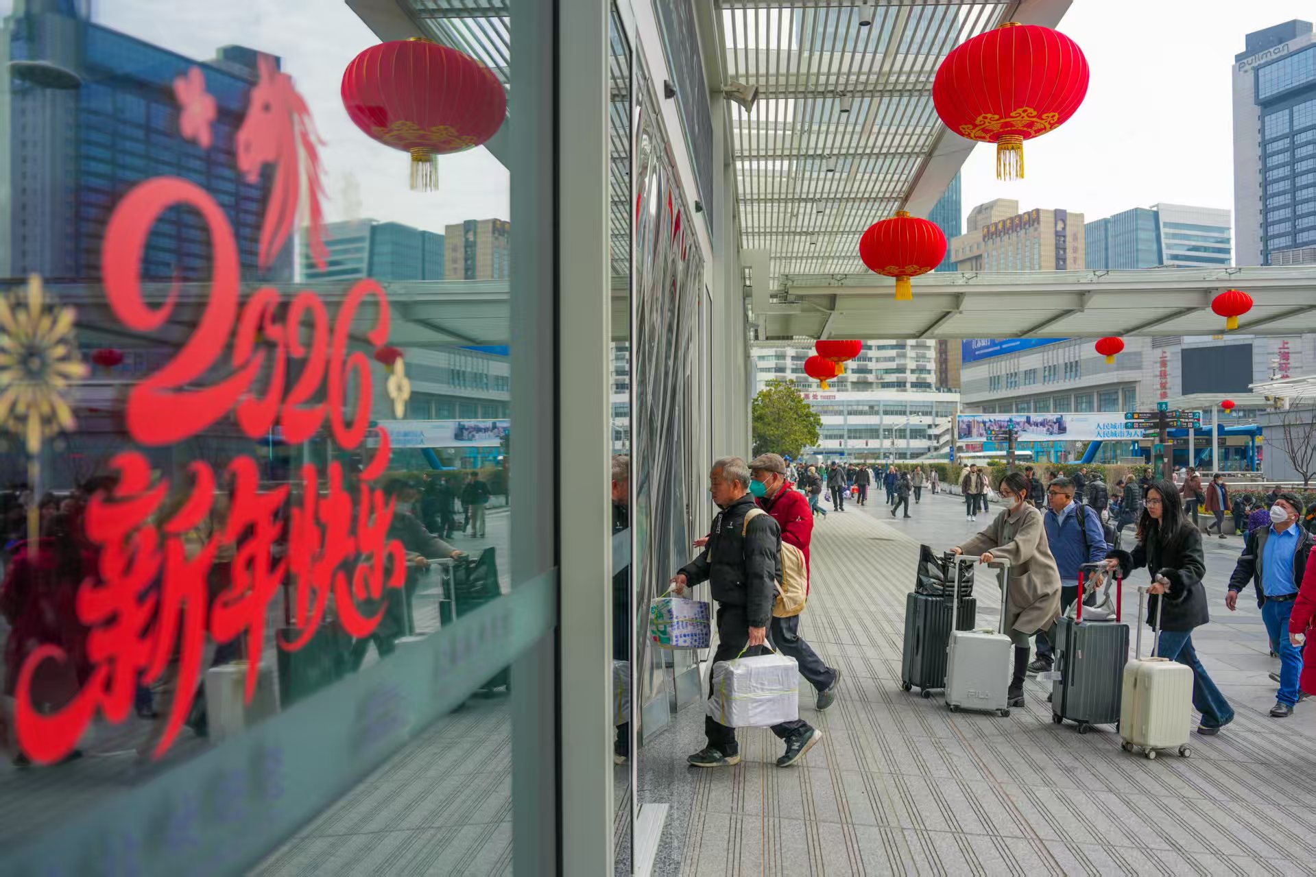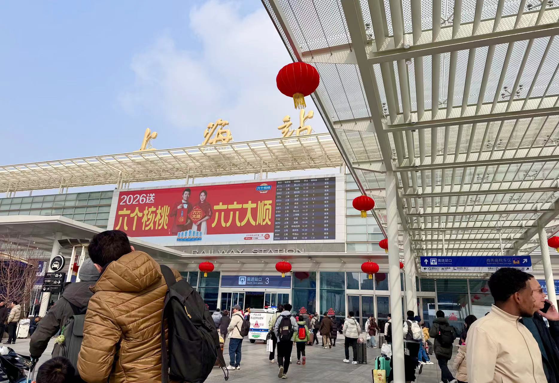 上海站南进出口外张贴着马年新春装饰,新年气氛浓郁。摄影 颜筱依