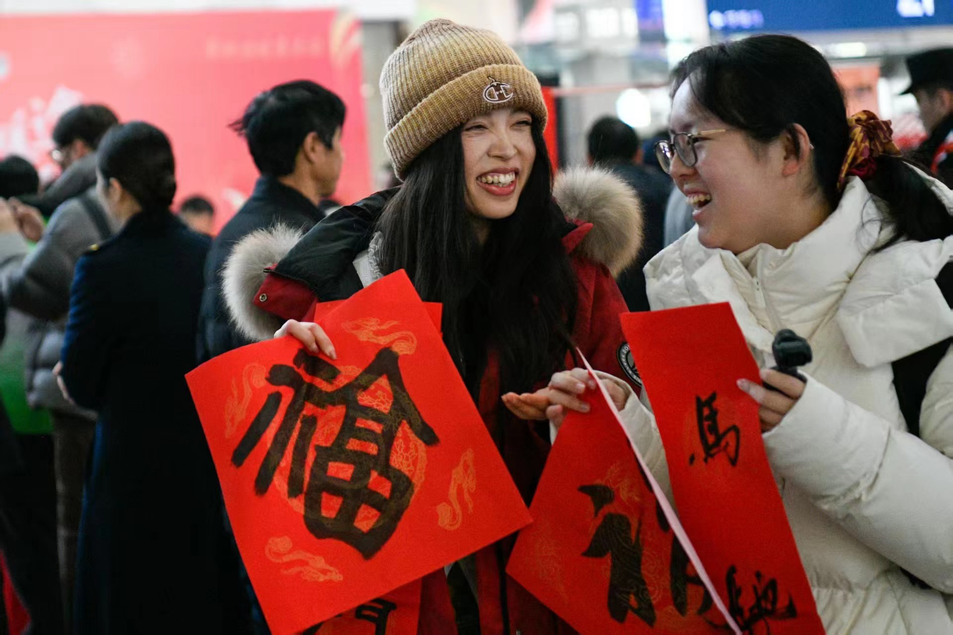 回家之前,旅客们还不忘“接福”,带着各种春联和福字。摄影 颜筱依
