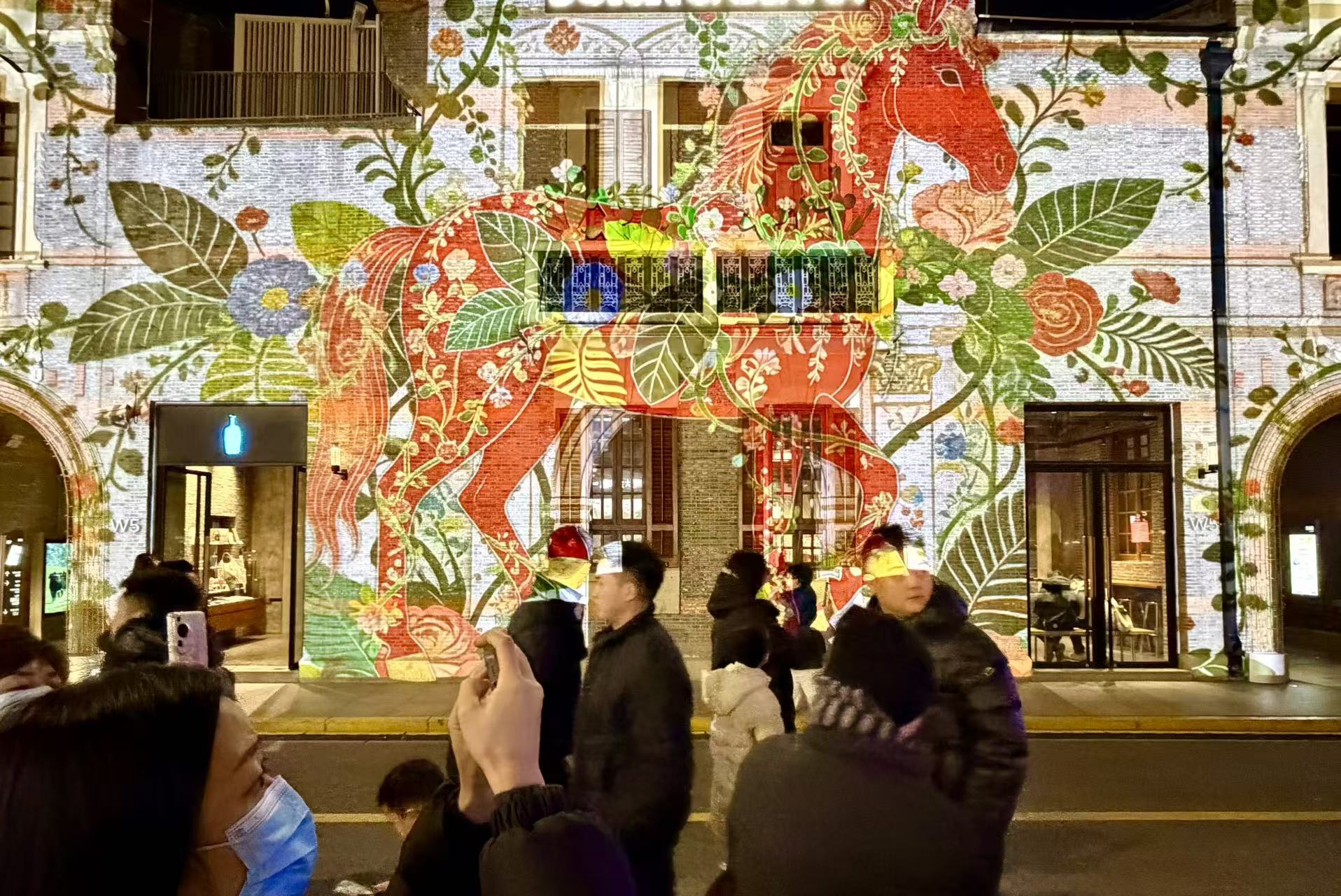 走到张园W5,可以看到六匹飞驰的骏马从悲鸿画作之中飞驰而出,穿越过一个个缤纷多样的奇异时空:色彩与笔触构成的东西并映融合时空,缠枝花卉与温暖毛毡交织的美好时空,未来时空与星河霓虹连接的绚烂时空……这是本次光影秀联动徐悲鸿美术馆推出的《一马当先》展项,以徐悲鸿《奔马图》《群奔图》为创意原点,打造核心数字内容,呈现非遗文化和新春氛围。