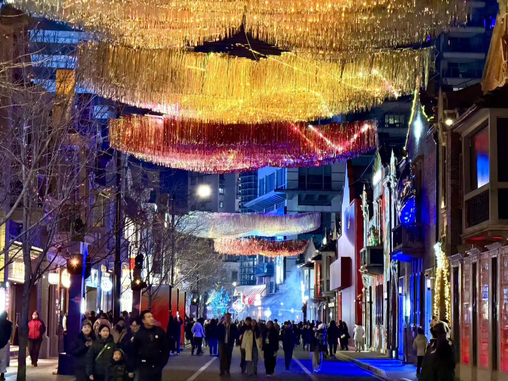 夜幕降临,漫步茂名北路,抬头可以看到流光溢彩的镭射流苏光影装置,这正是《天河奔马》展项,中国传统的葫芦、寿桃、方胜、银锭、海棠等吉祥纹样在此呈现,“福禄寿禧财”五福光影给新年增添好彩头;路中间还设置了通过激光镭射球打造的展项《新岁》,灯光绽放出如同钻石和烟花一般璀璨的光芒,激光与镭射球在城市空间中编织出具有新春韵味的光线。
