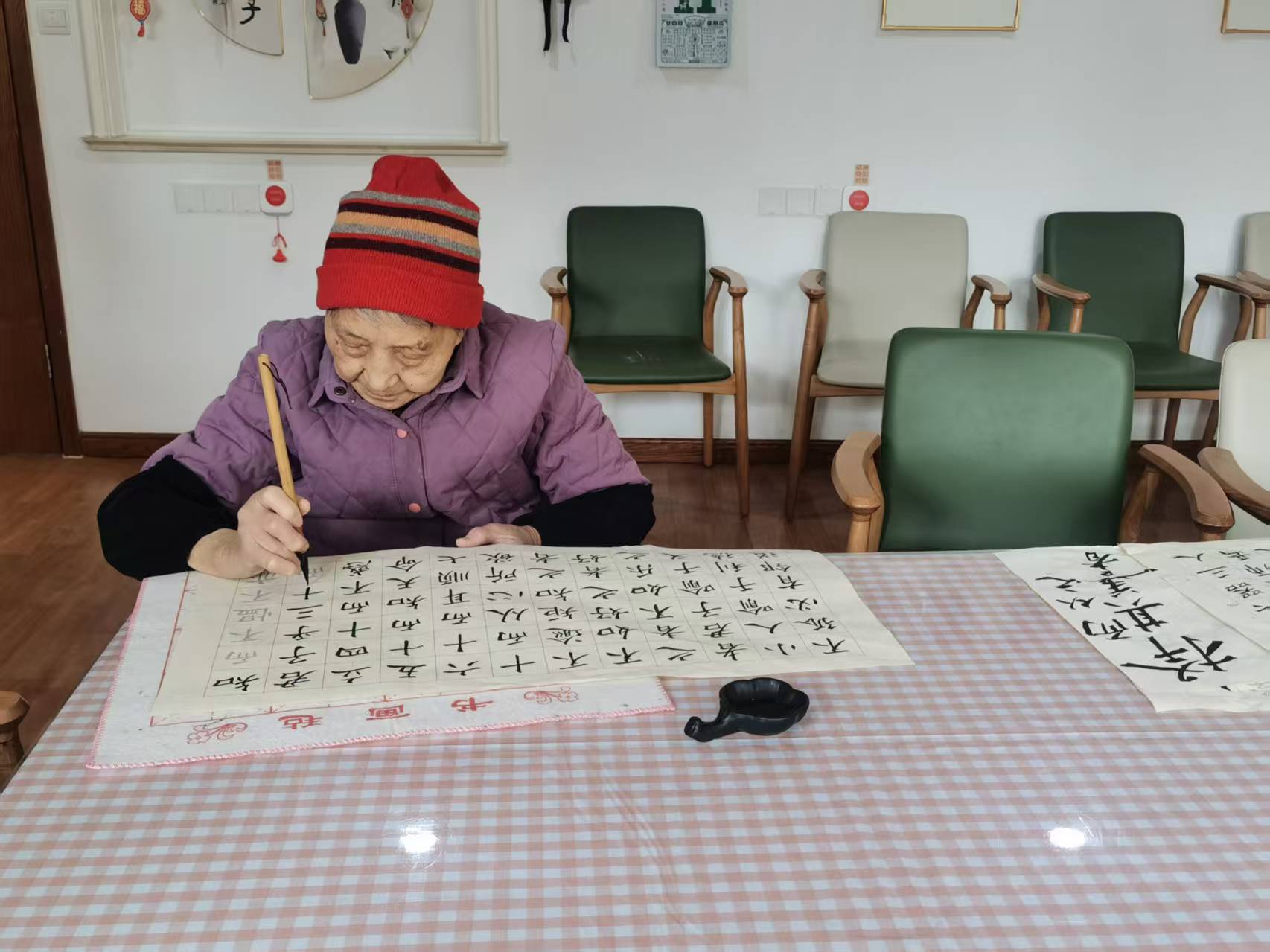 住在三福院的老人正在写毛笔字。劳动报记者王嘉露 摄影