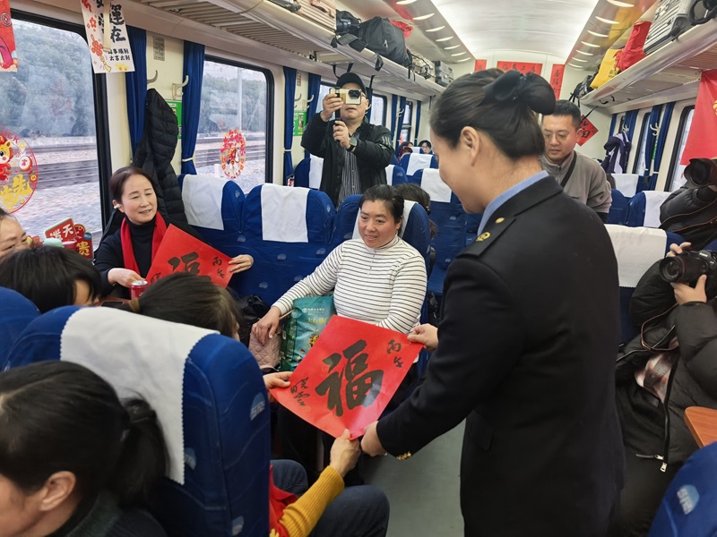 上海铁路客运段乘务员为搭乘返乡专列的乘客送上福字。铁路部门供图