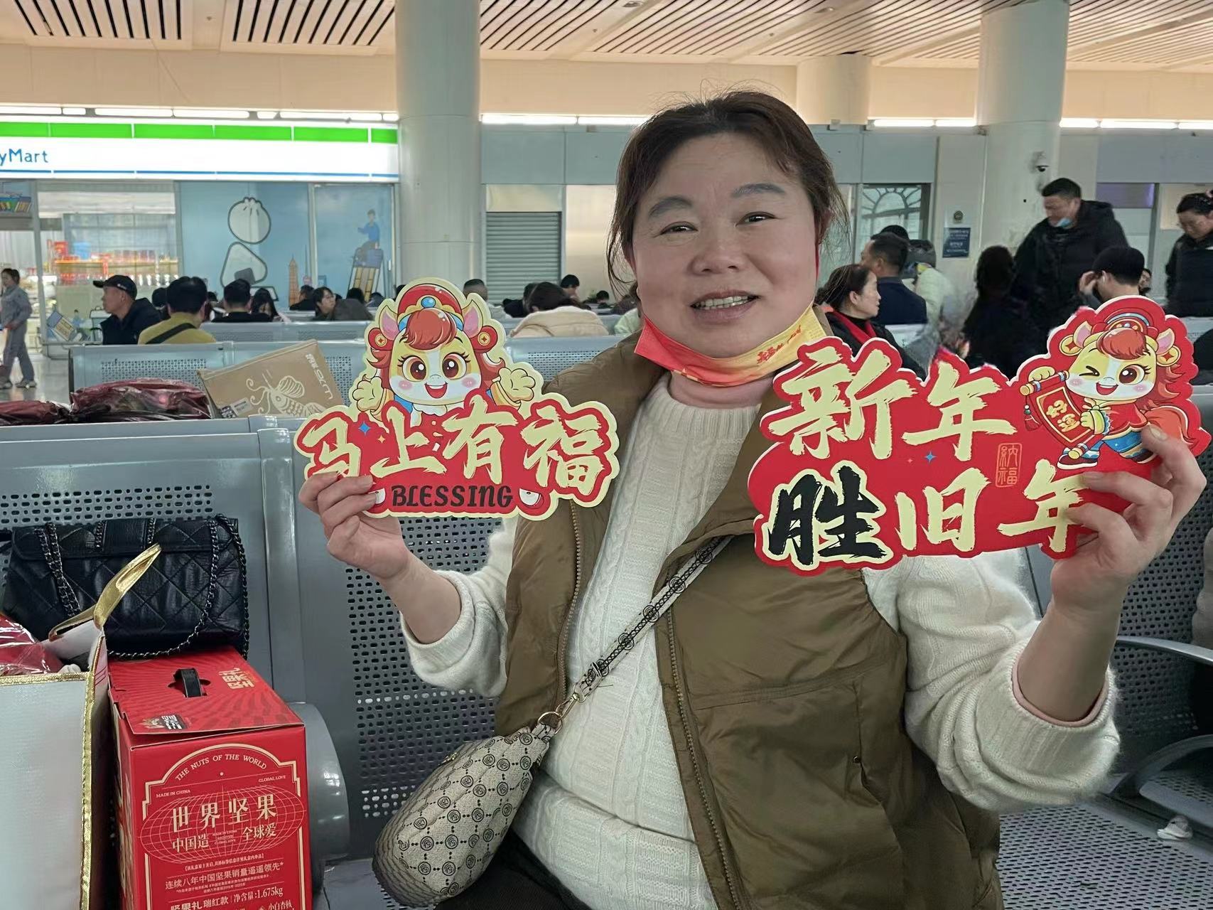 为了能够保障返乡旅客一路顺利,值乘这趟列车的上海铁路客运段沪襄车队也做足了充分准备。开车后不久,乘务员就为在外奔波忙碌了一整年的游子们送上了充满祝福的新年福字,寓意着来年福气满满、吉祥如意。