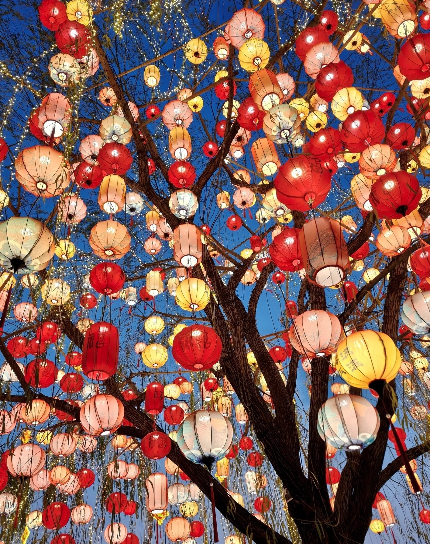 头图为菏泽巷子里的古树上挂满福字灯笼。劳动报记者马亚会摄影
