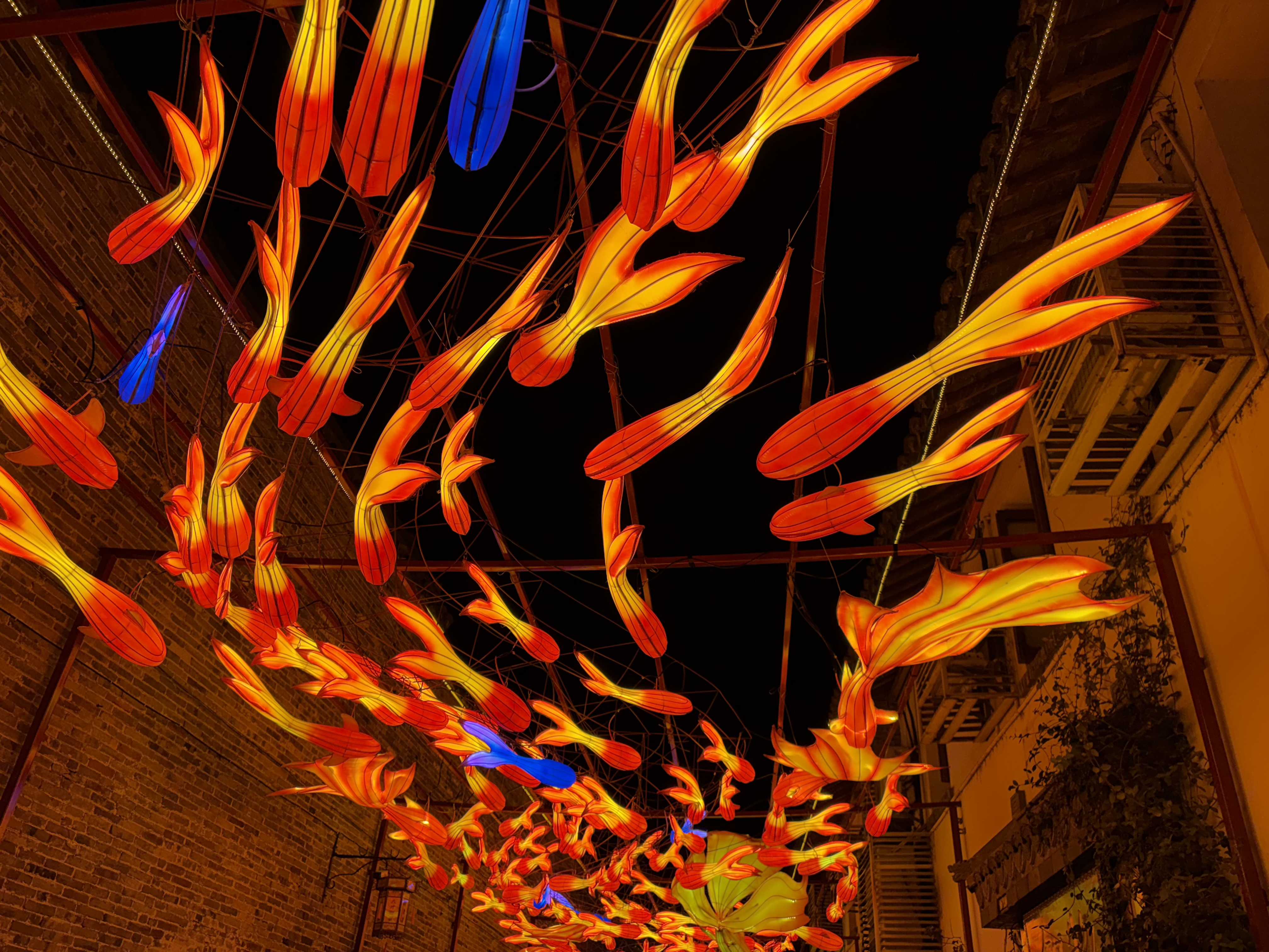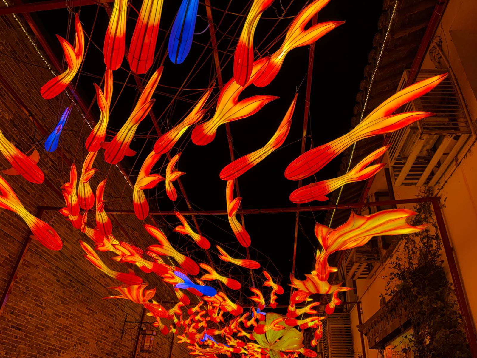夜幕下的江苏镇江西津渡,成串灯饰如游鱼般在空中流转,暖红与金色交织出浓浓年味。劳动报记者唐一泓摄影
