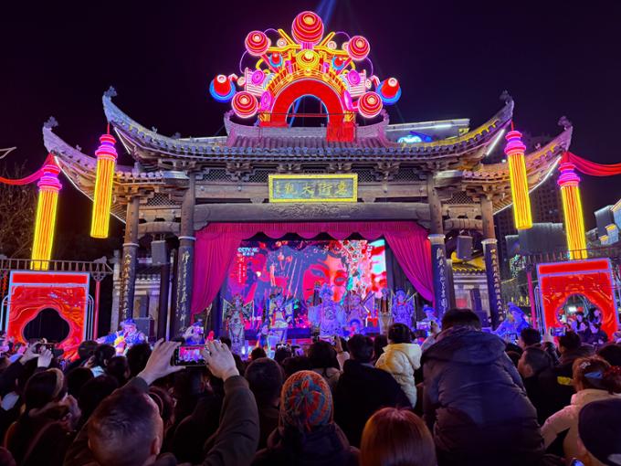 大年初一晚上,安徽合肥“罍街大观”戏台上灯火璀璨,黄梅戏表演精彩上演,市民游客感受戏韵悠扬的传统年味。劳动报记者李美慧摄影