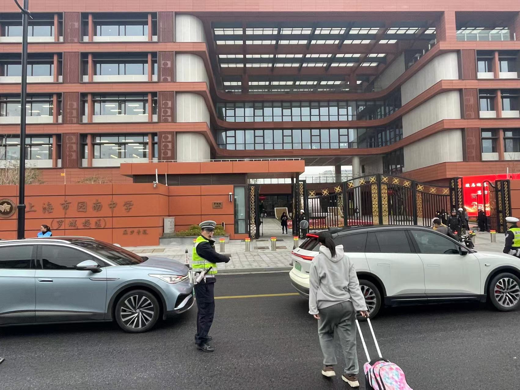 浦东交管正在校园周边车流密集处设岗指引。浦东警方供图
