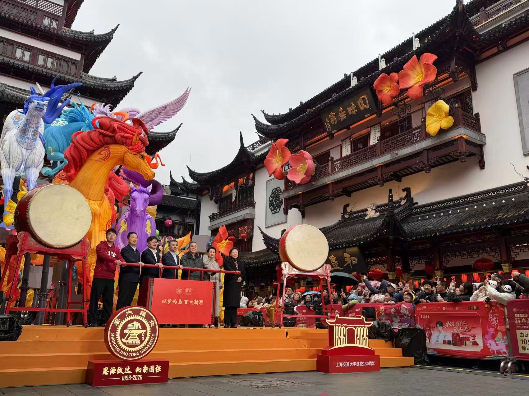 鼓乐齐鸣间,仪式正式拉开序幕。师生校友代表共同启动亮灯装置,点亮豫园灯会中属于交大的璀璨光彩。上海交通大学校徽与建校130周年主题标识装置醒目亮相,一旁“新年好 交大运”的打卡点位也备受青睐,师生校友纷纷驻足合影,将这份豫园与交大交融的美好瞬间定格。交大师生与广大市民齐聚观礼,现场人头攒动、气氛热烈。