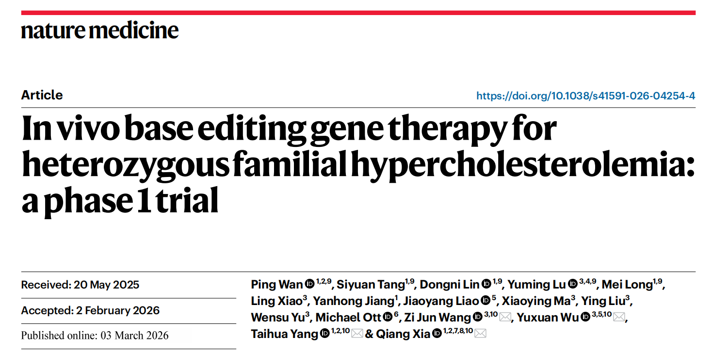 3月3日,上海交通大学医学院附属仁济医院发表重磅科研成果,中国工程院院士、仁济医院院长夏强领衔的团队,在国际顶尖学术期刊《自然・医学》(Nature Medicine,IF 50.0)发表全球首个运用肝脏靶向体内碱基编辑技术治疗杂合子家族性高胆固醇血症的Ⅰ期临床试验结果。这一研究首次在人体中证实了该基因治疗手段的安全性和有效性,为这一遗传代谢性肝病患者摆脱终身用药负担带来全新希望。