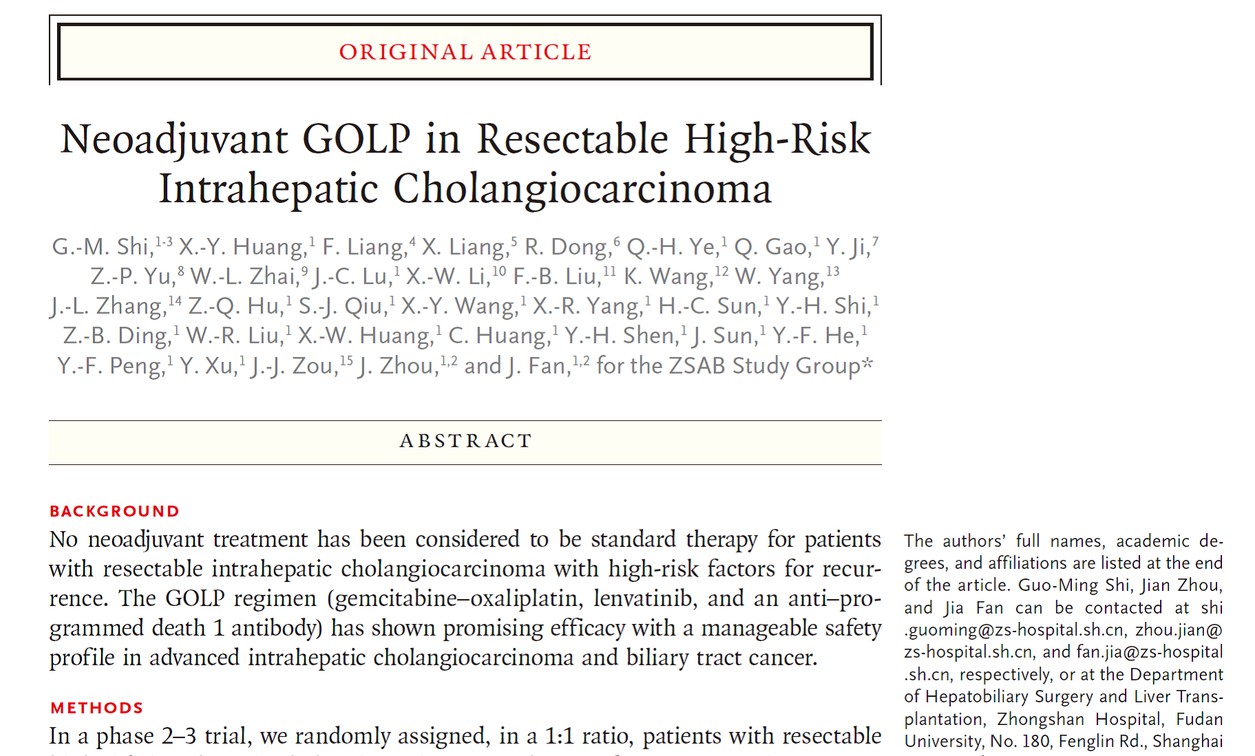 3月5日,复旦大学附属中山医院肝胆肿瘤与肝移植外科透露,樊嘉院士、周俭院士、施国明教授团队在国际医学顶刊《新英格兰医学》(The New England Journal of Medicine)上发表一项临床研究突破性成果:新辅助GOLP方案在可切除、伴高危复发肝内胆管癌治疗中的价值,给这些高危复发的肝内胆管癌病人带来长期生存的希望。
