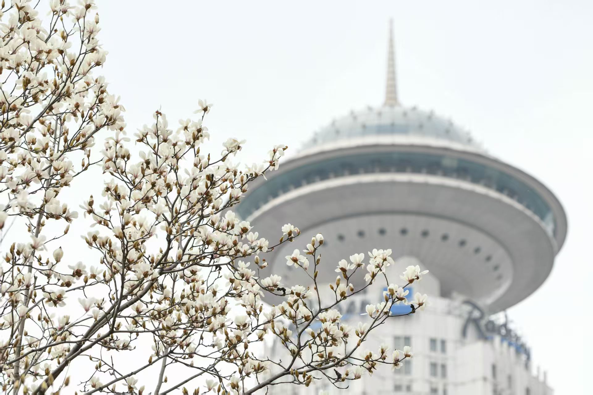头图为白玉兰绽放,与城市地标同框。劳动报记者 颜筱依 摄影