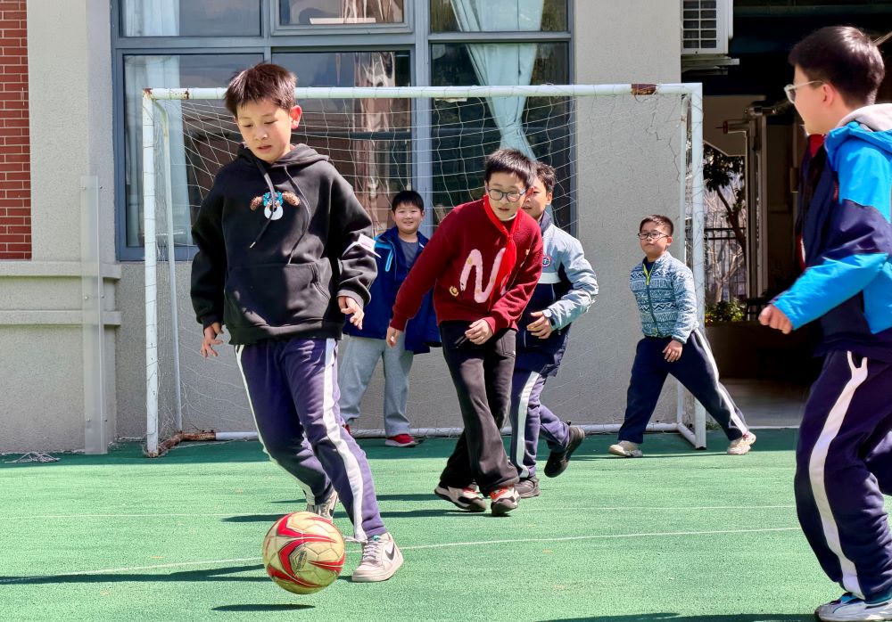 在黄浦区卢湾一中心小学,孩子们首次迎来了“课间15分钟”。下课铃一响,在老师的鼓励下,孩子们纷纷走出教室,和好朋友们三五成群活动起来。在教学楼各个楼面走廊,学校设置了“24节气”“12生肖”跳房子等游戏地贴和AI智慧屏,孩子们可以互动游戏。也有同学走到操场,踢足球、跳绳,也有孩子在单杠上跃跃欲试,挑战引体向上。