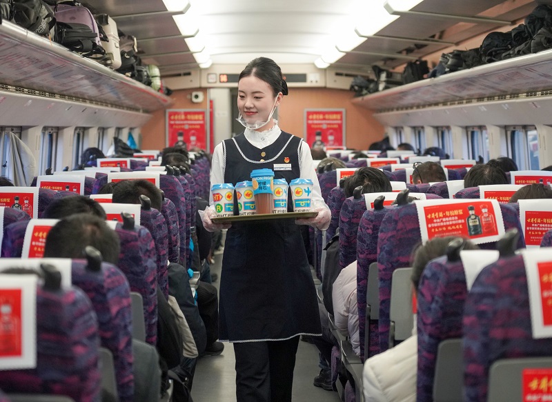 头图为餐饮乘务员正在车厢内销售网红奶茶。受访单位供图