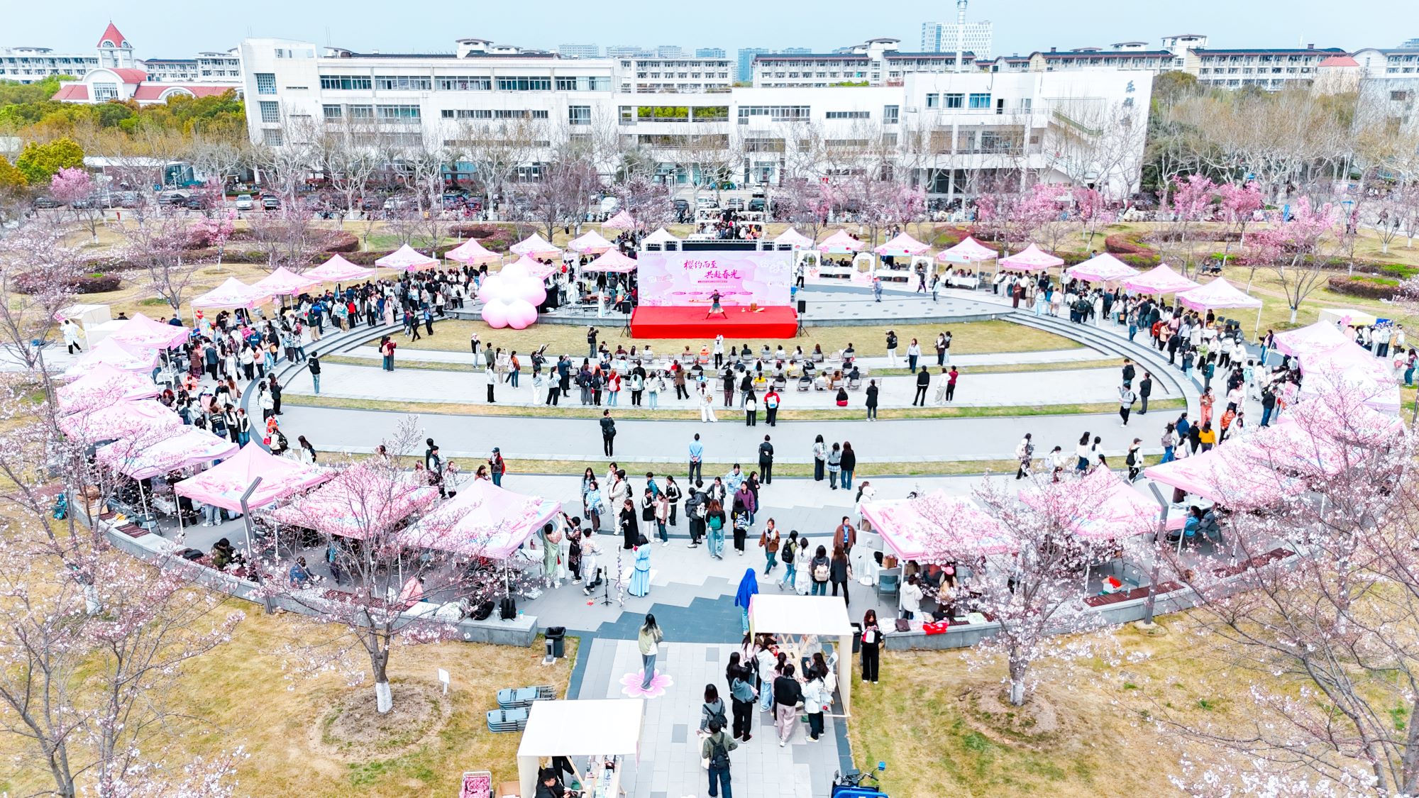 演出之外,下沉式广场两侧粉白交叠,作为上海对外经贸大学校园文化品牌活动之一的“一月一市集”也随樱花节开展。50个特色摊位依次排开,涵盖缤纷演艺、樱味珍馐、非遗技艺、樱花雅集等内容,吸引了师生和市民游客驻足体验,各摊位前人头攒动。