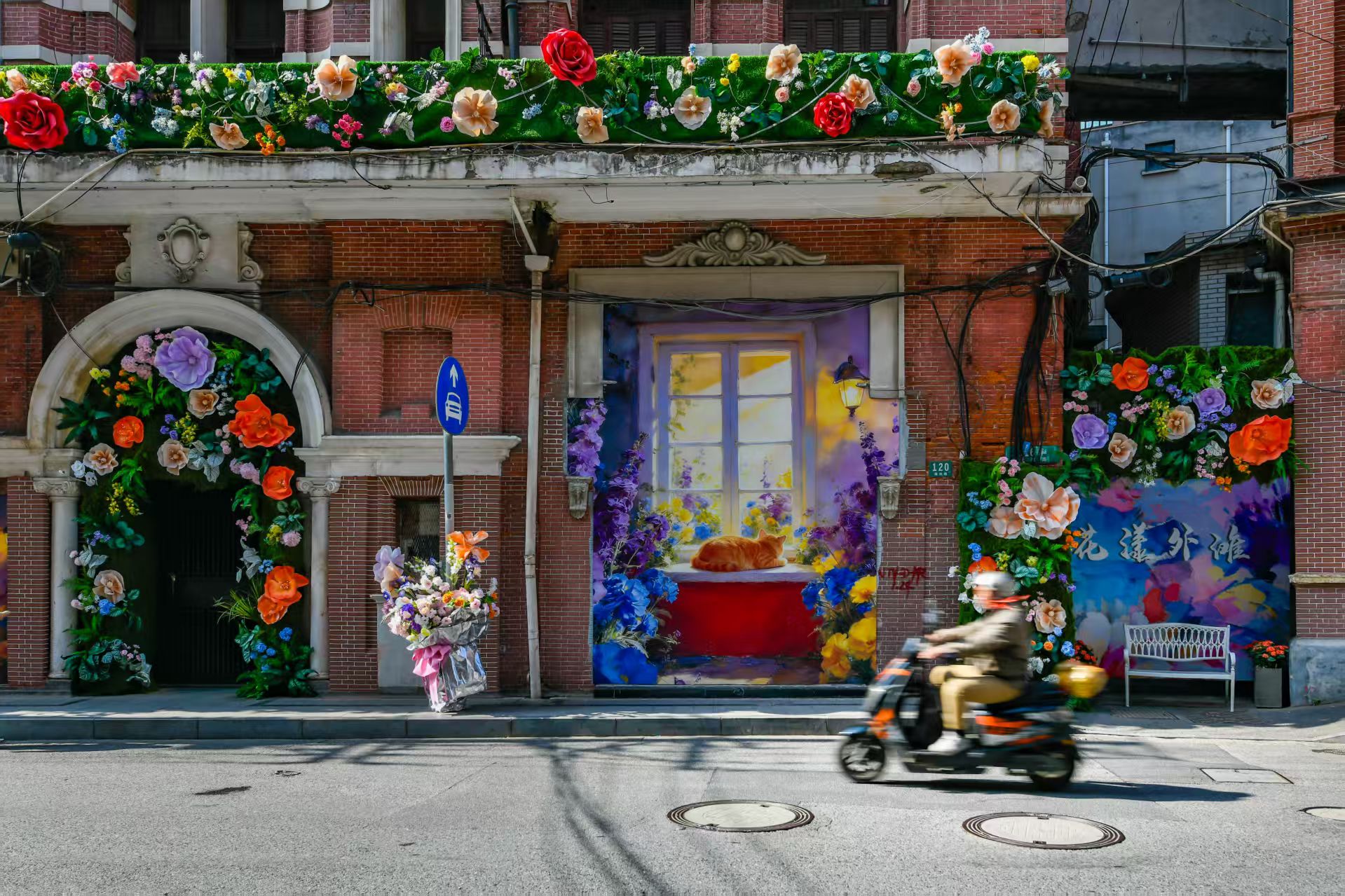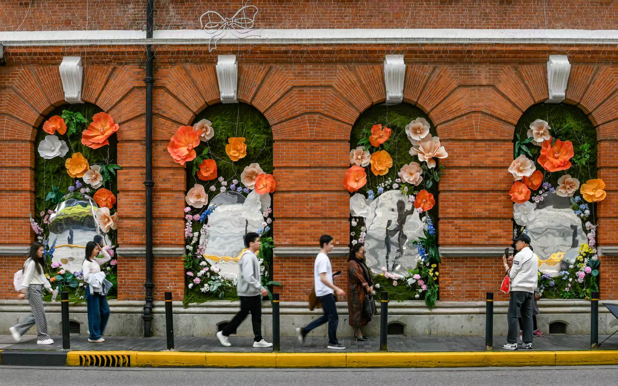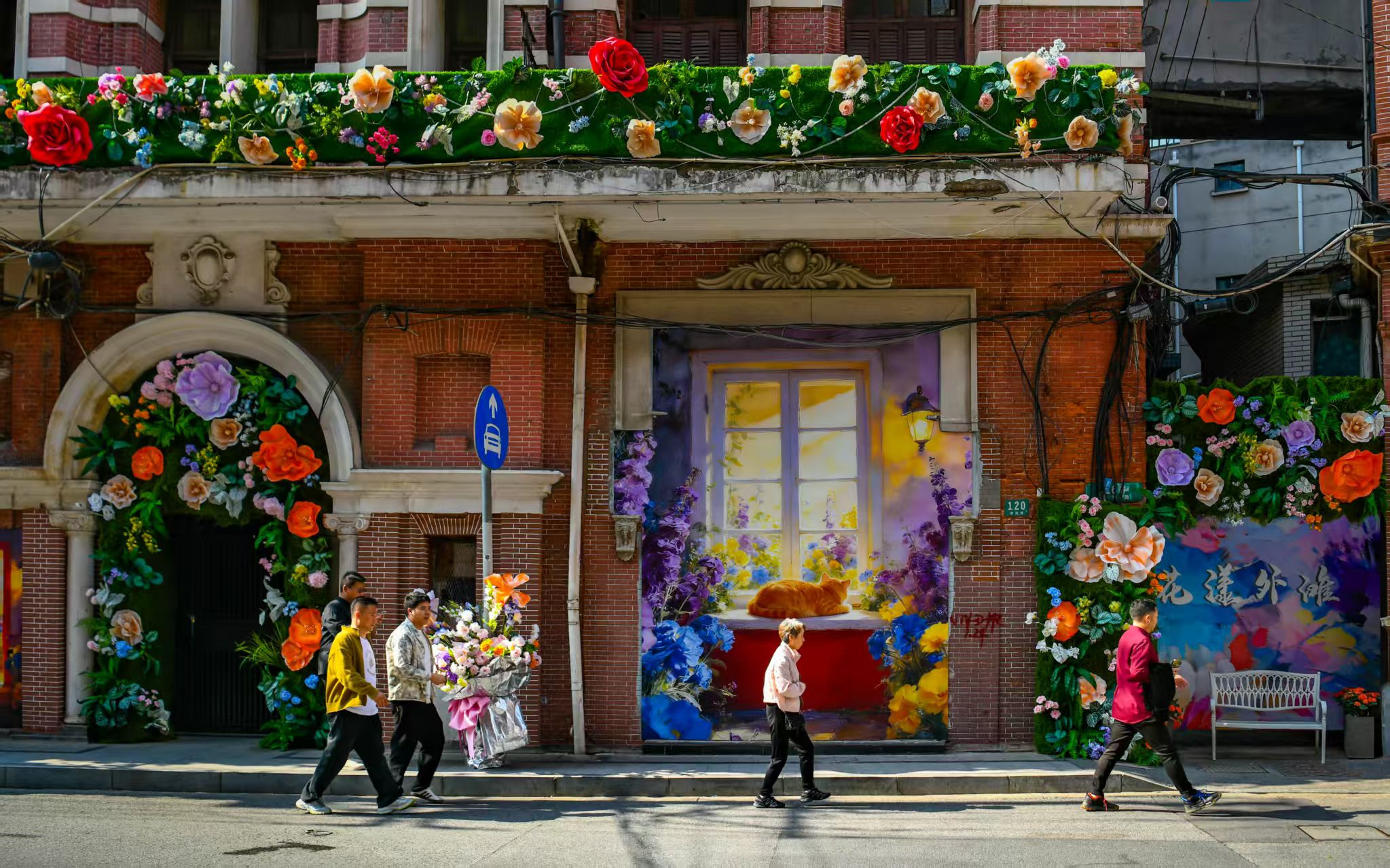 从四川中路到北京东路,百年建筑被鲜花覆盖,披上了五彩斑斓的“花衣”,构成一副美丽的城市画卷。