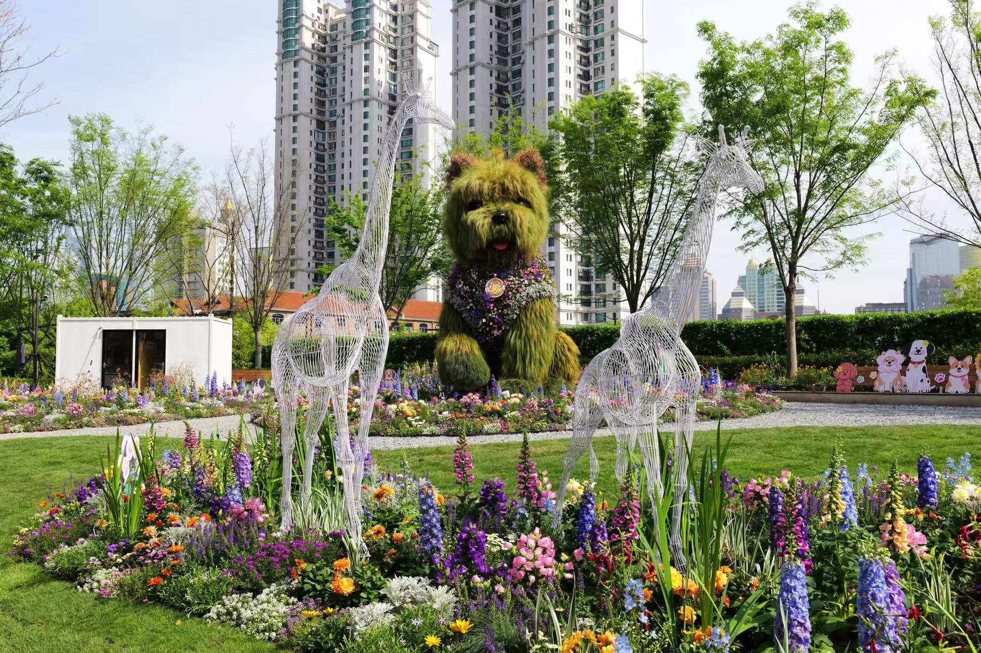 在苏河湾中心绿地展区,市民游客可以由苏河湾中心南侧出发,依次漫游“六园九景”各景点。其中,一座5.2米高的“潦草小狗”格外吸睛,还未完成便已在社交平台引发关注。据了解,这座小狗位于景点花漾萌宠乐园内,以花艺赋能人宠共生空间,打造沉浸式体验,核心亮点包括巨型宠物主题绿植雕塑、长颈鹿绿雕,设计巧妙融合鲜花、绿植与树脂玻璃钢材料,打造了多个沉浸式合影打卡点。该方案不仅展示了精湛的园艺技艺,更为宠物爱好者构建了一个充满想象力的“花漾”乌托邦,倡导在城市绿洲中享受人与萌宠的和谐时光。