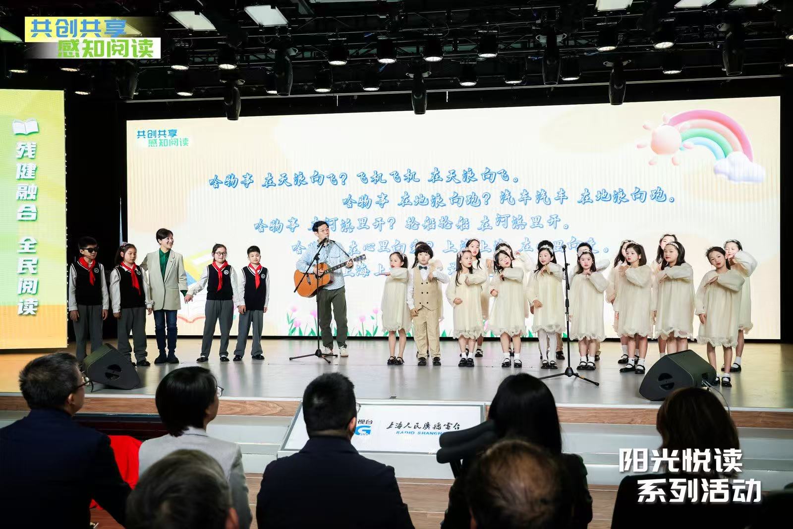 活动一开始,上海童谣唱作人王渊超便与上海市盲童学校四位同学、上海市实验学校国际部童声合唱团,以及手语翻译陈伊佳,共同带来了融合共创节目《做生活的诗人》,沪语的软糯、童谣的轻快、手语的翻译、合诵的共振以及现场灯光的聚焦……多种“语言”的交织,不仅为活动带来了一场别开生面的开场,更让观众可以沉浸式调动全身心去感知最是书香的美好与力量。