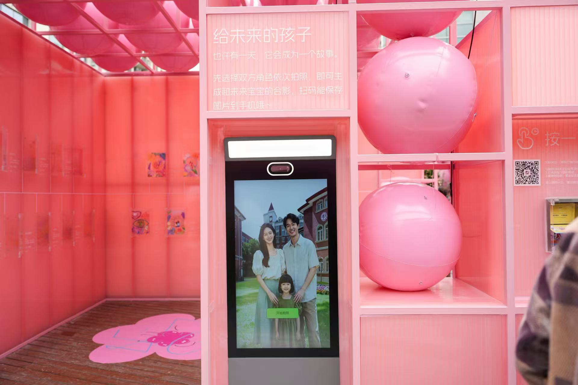置身于多个创意新颖的互动装置间,孕育的温情与生命的印记,变得触手可及,参观的体验感和仪式感瞬间拉满。在AI相机互动区,男女双方可以分别拍摄一张照片,即可生成与未来宝宝的合照,让未出世的小生命提前“打卡”生命起点。