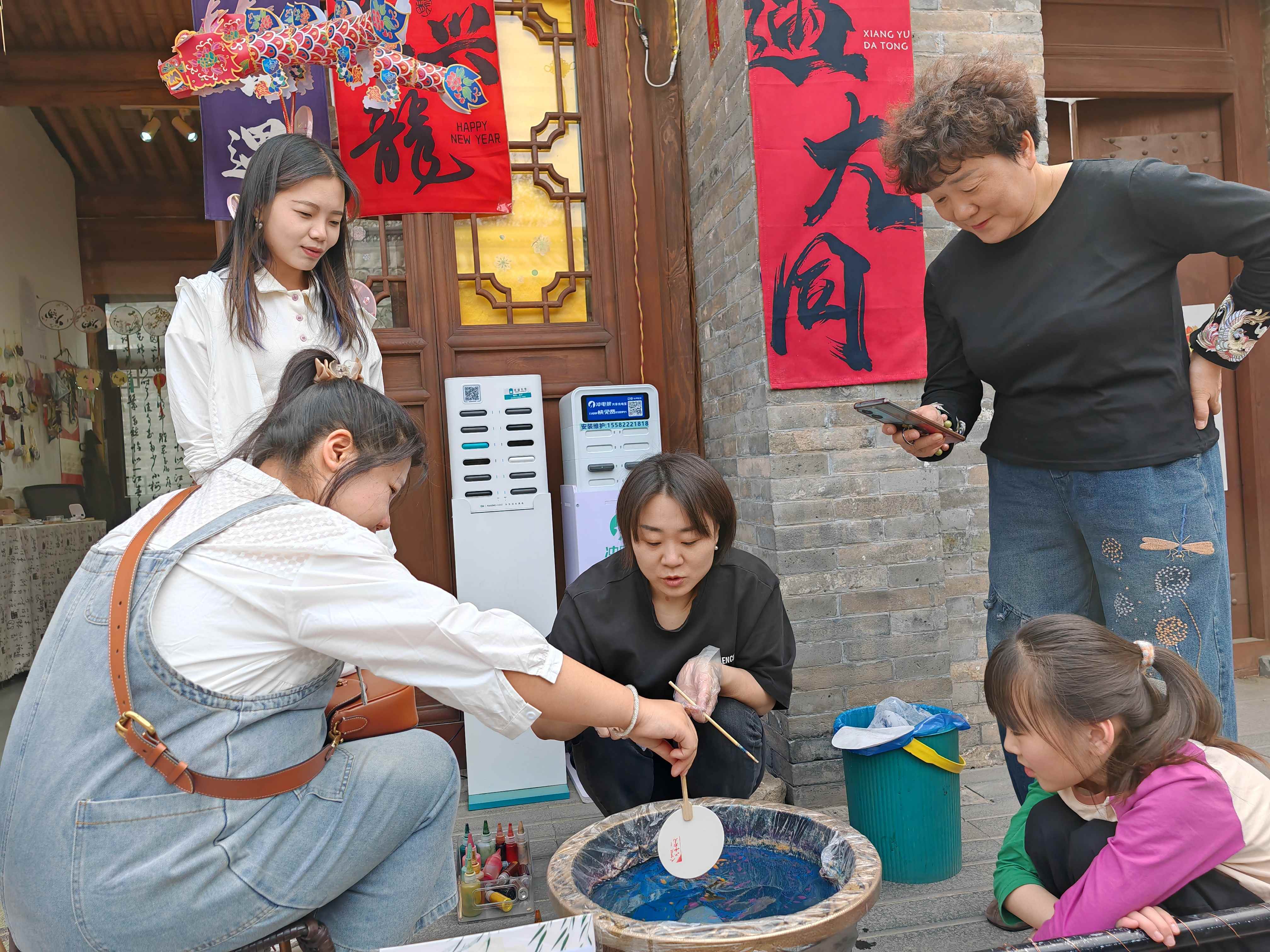 一个小店门口放着一口水缸,里面有大半缸清水,只见女店主将调制好的色漆轻轻滴入水中,当漂漆在水面形成发散形状绚丽的花纹时,一个年轻的女游客在店主的指点下,将一把团扇沉浸其中,并缓缓搅动。