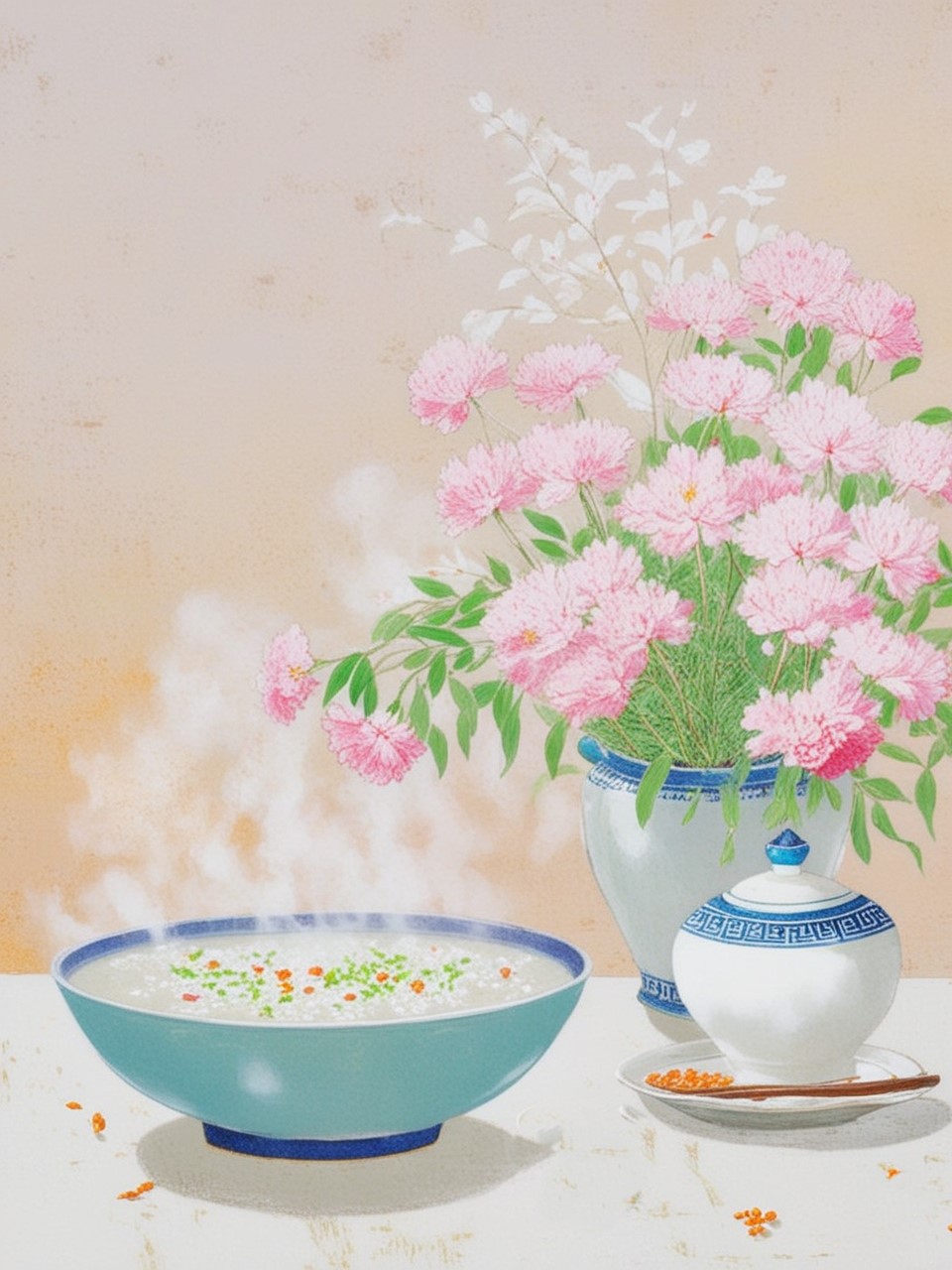 论吃粥的雅致,不能不提南宋诗人杨万里,他见落梅便叹道:“才看腊后得春饶,愁见风前作雪飘。”同时代林洪在《山家清供》中记载了梅花粥的做法:“扫落梅英,拣净洗之,用雪水同上白米煮粥。候熟,入英同煮。”此粥吃的是梅花冰肌玉魄的高洁与清雅幽静的情趣。