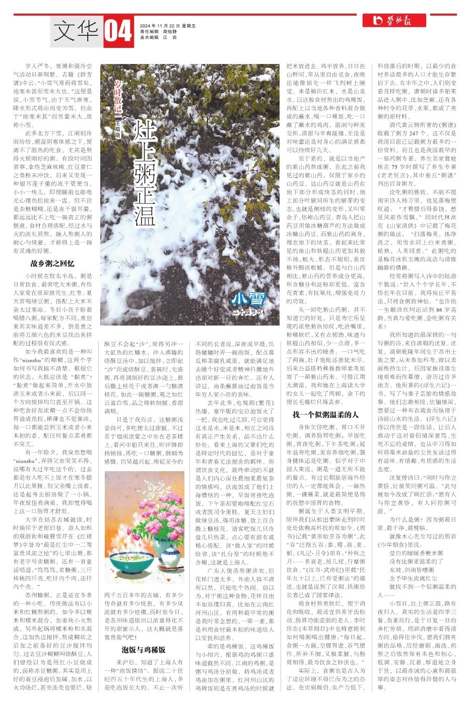 小雪日,灶上粥正温,路有夜归人。真实的生活是四季三餐、负重而行,是于日复一日的奔忙劳烦、琐碎消磨中看得清方向,稳得住步伐。愿我们拥有粥的品格,历经磨砺、淘洗、煎熬之后依然保有本色和初心,低调、安静、沉着、厚道地立身于世,以最赤诚的心意和最温厚的姿态对待值得珍惜的人与事。