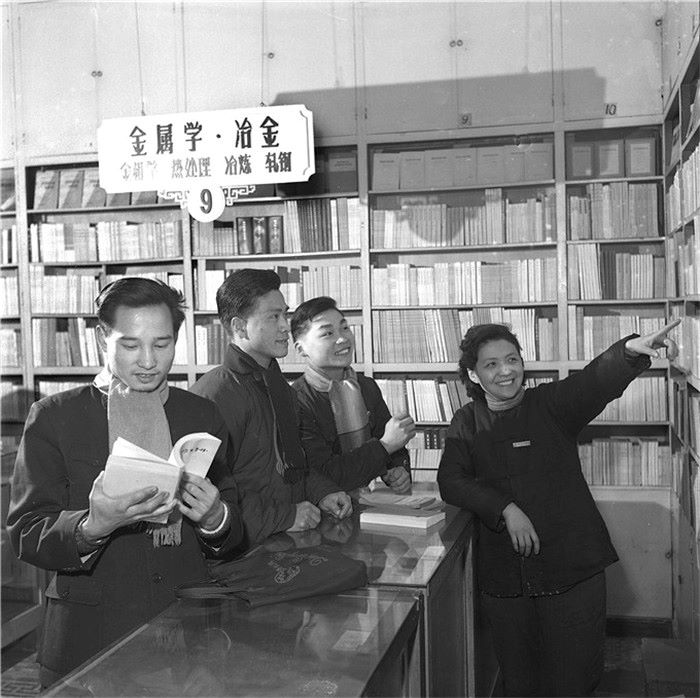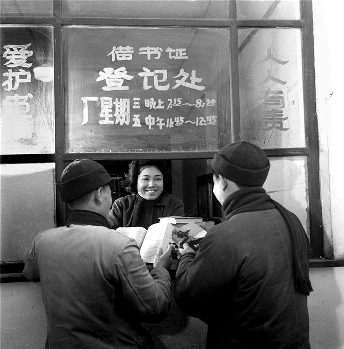 上世纪50年代上海机床厂职工在俱乐部图书室借阅图书
